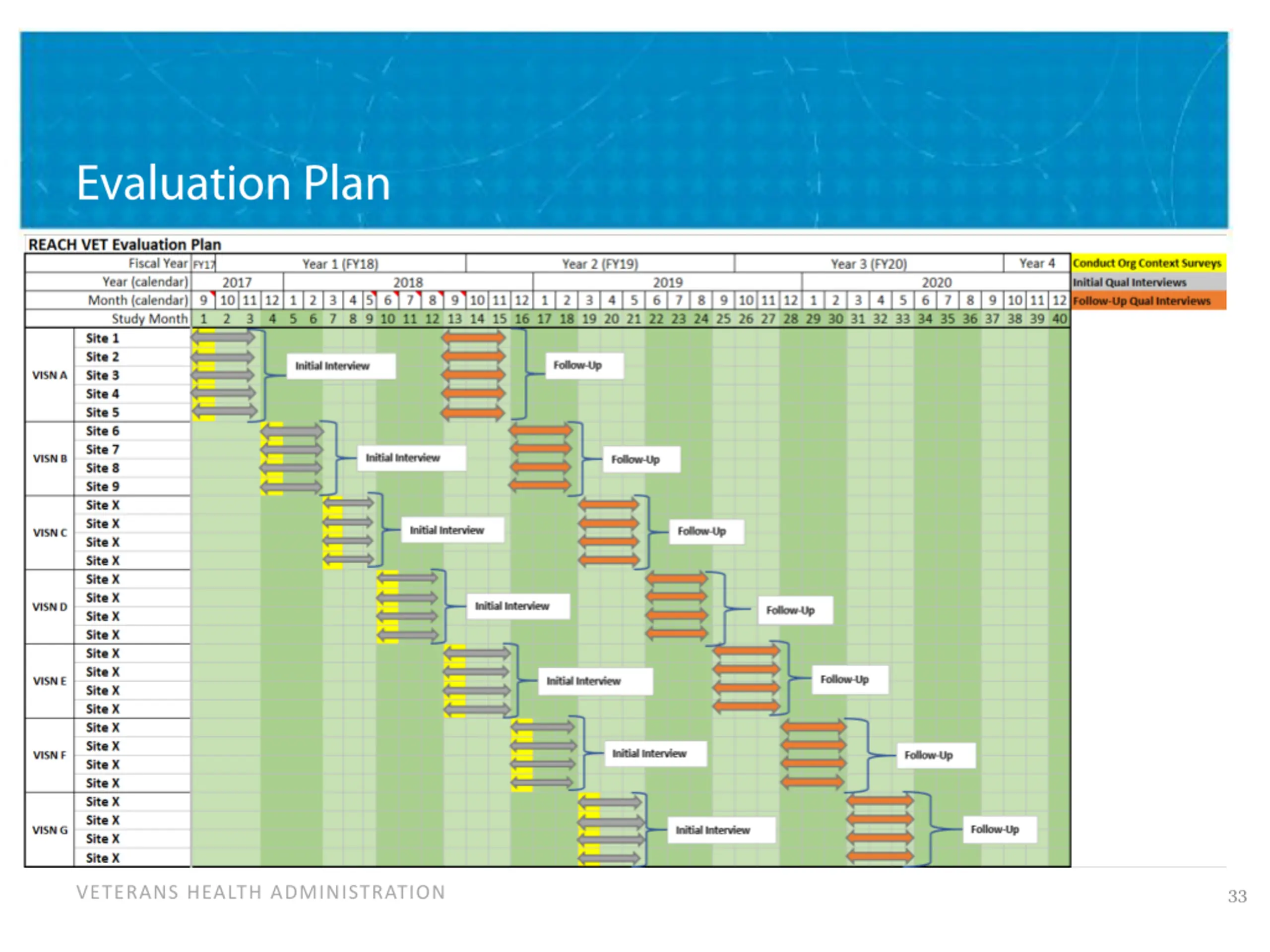 Given that the grant was funded to evaluate a program being implemented, the evaluation design had to change to accommodate changes in the program The design started as a stepped wedge Changed to a crossover design And has since returned to a stepped wedge The program and evaluation have been impacted by Changes in national VA leadership Changes in funding Changes in the clinical intervention Changes in timeline Changes in targeted facilities As the evaluation team, we are documenting these changes to demonstrate how they may have impacted implementation VETERANS HEALTH ADMINISTRATION 29