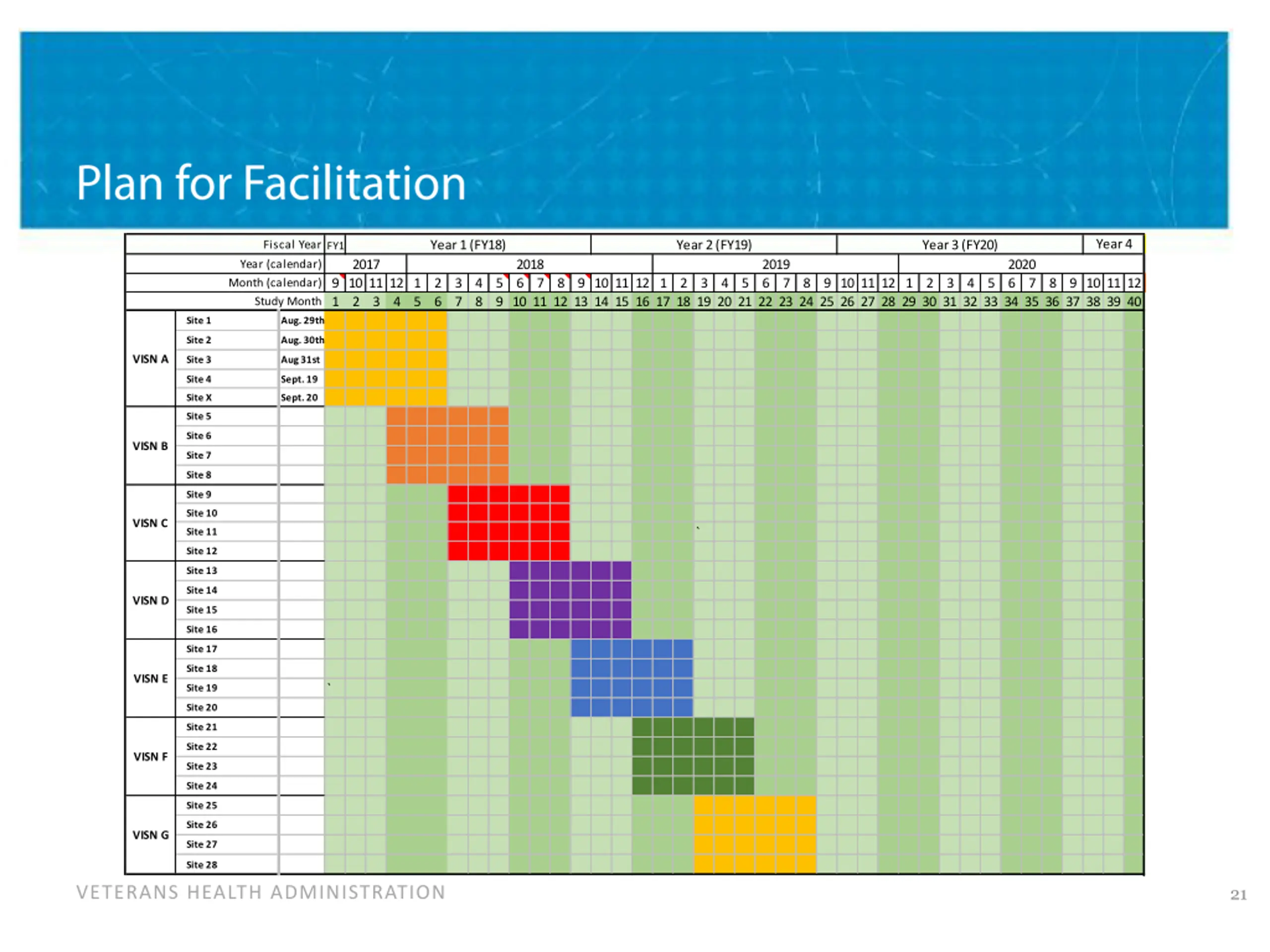 Year 4 Year 2 (FY19) Year 3 (FY20) Year 1 (FY18) Fiscal Year FY17 2017 2018 2019 2020 Year (calendar) 9 10 11 12 1 2 3 4 5 6 7 8 9 10 11 12 1 2 3 4 5 6 7 8 9 10 11 12 1 2 3 4 5 6 7 8 9 10 11 12 1 2 3 4 5 6 7 8 9 10 11 12 13 14 15 16 17 18 19 20 21 22 23 24 25 26 27 28 29 30 31 32 33 34 35 36 37 38 39 40 Month (calendar) Study Month Site 1 Aug. 29th Site 2 Aug. 30th VISN A Site 3 Aug 31st Site 4 Sept. 19 Site X Sept. 20 Site 5 Site 6 VISN B Site 7 Site 8 Site 9 Site 10 VISN C ` Site 11 Site 12 Site 13 Site 14 VISN D Site 15 Site 16 Site 17 Site 18 VISN E ` Site 19 Site 20 Site 21 Site 22 VISN F Site 23 Site 24 Site 25 Site 26 VISN G Site 27 Site 28 VETERANS HEALTH ADMINISTRATION 21