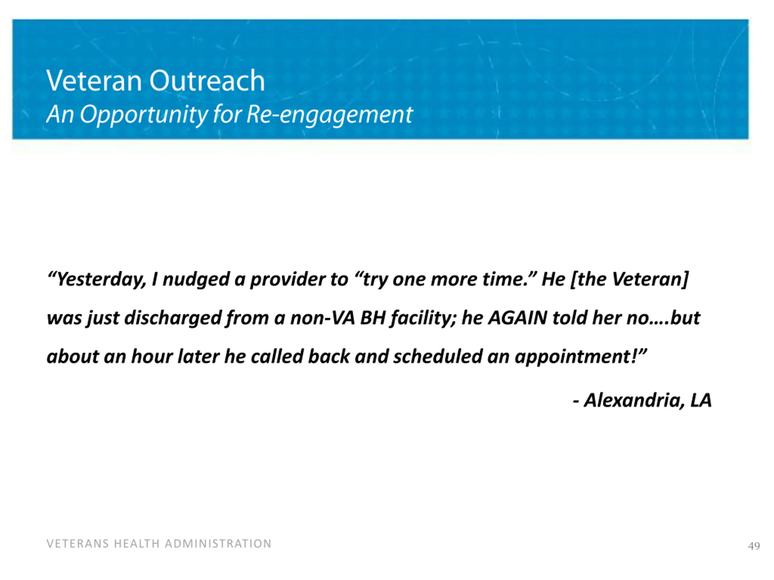 Yesterday, I nudged a provider to try one more time. He [the Veteran] was just discharged from a non-VA BH facility; he AGAIN told her no .but about an hour later he called back and scheduled an appointment! - Alexandria, LA VETERANS HEALTH ADMINISTRATION 49
