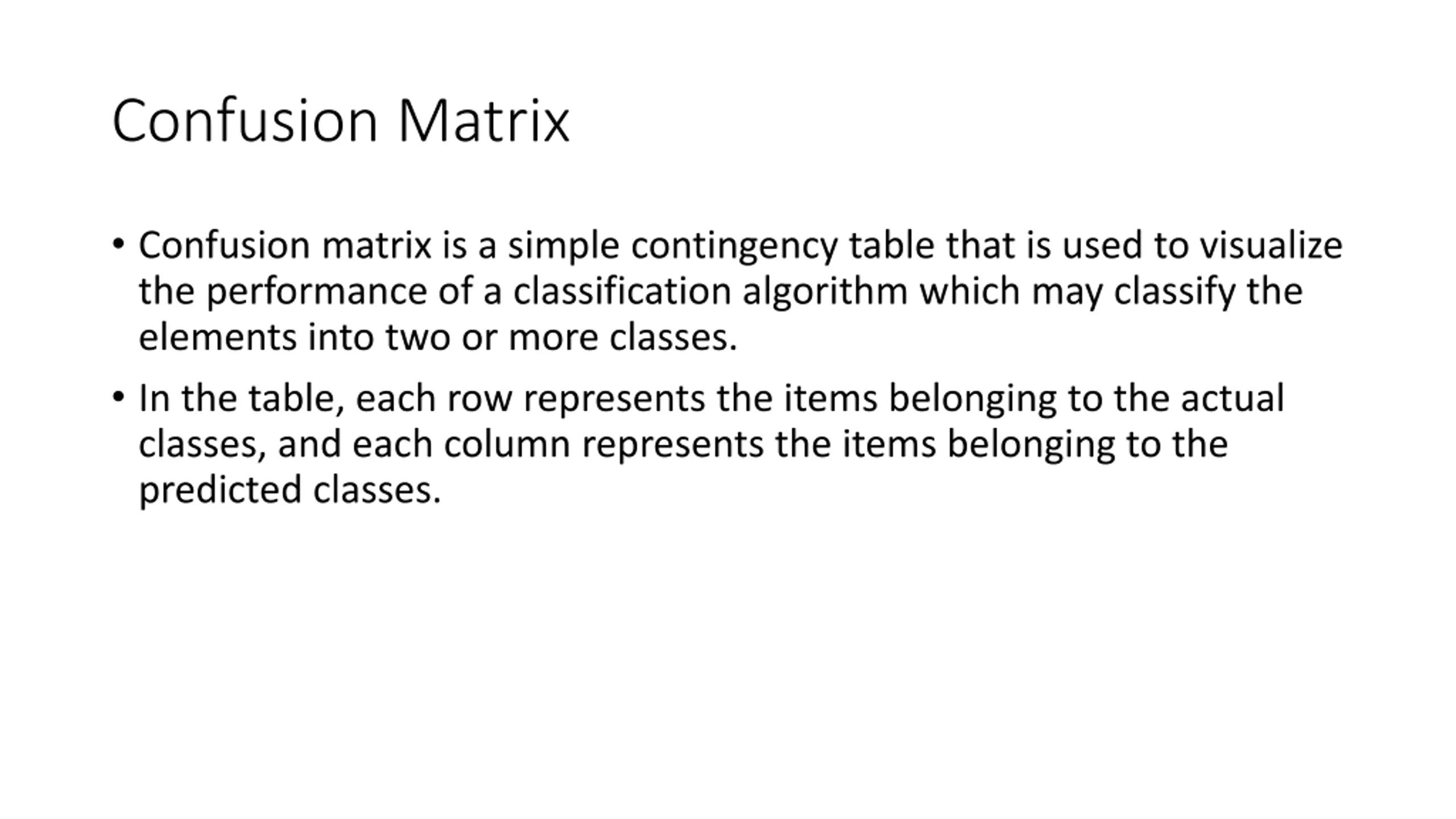 Confusion Matrix Confusion matrix is a simple contingency table that is used to visualize the performance of a classification algorithm which may classify the elements into two or more classes. In the table, each row represents the items belonging to the actual classes, and each column represents the items belonging to the predicted classes.