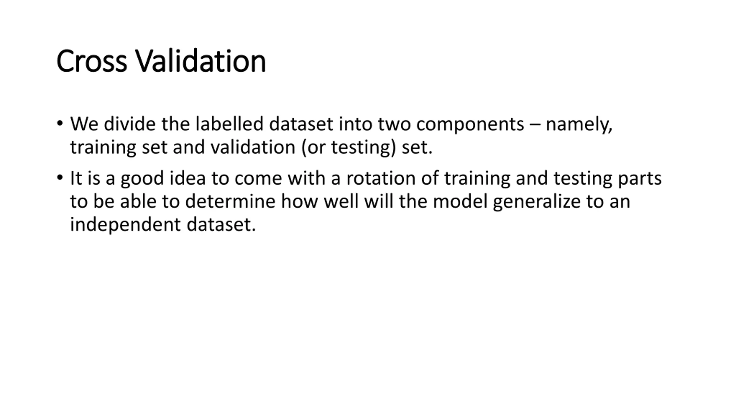 Cross Validation Cross Validation We divide the labelled dataset into two components namely, training set and validation (or testing) set. It is a good idea to come with a rotation of training and testing parts to be able to determine how well will the model generalize to an independent dataset.