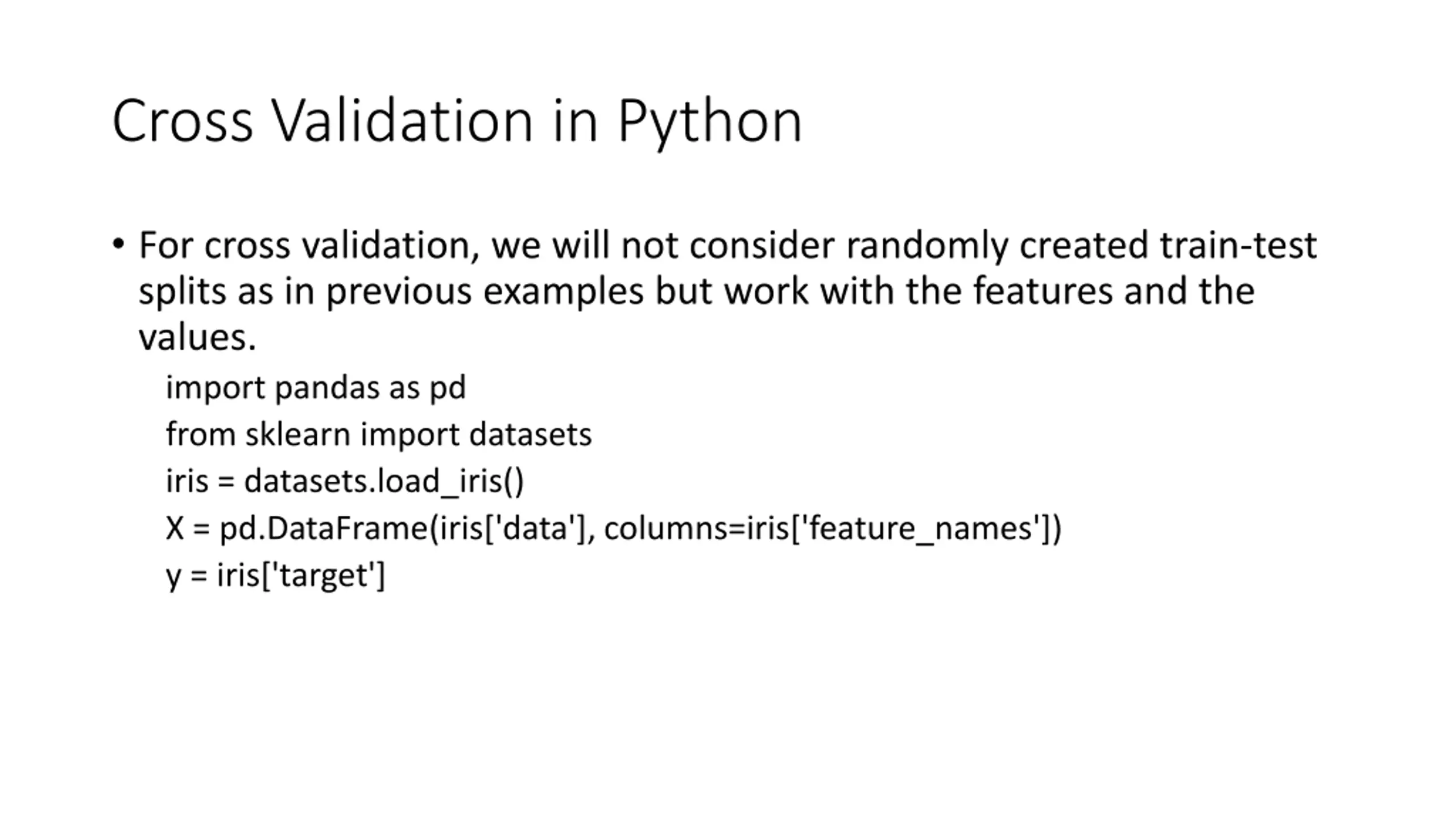 Cross Validation in Python For cross validation, we will not consider randomly created train-test splits as in previous examples but work with the features and the values. import pandas as pd from sklearn import datasets iris = datasets.load_iris() X = pd.DataFrame(iris['data'], columns=iris['feature_names']) y = iris['target']