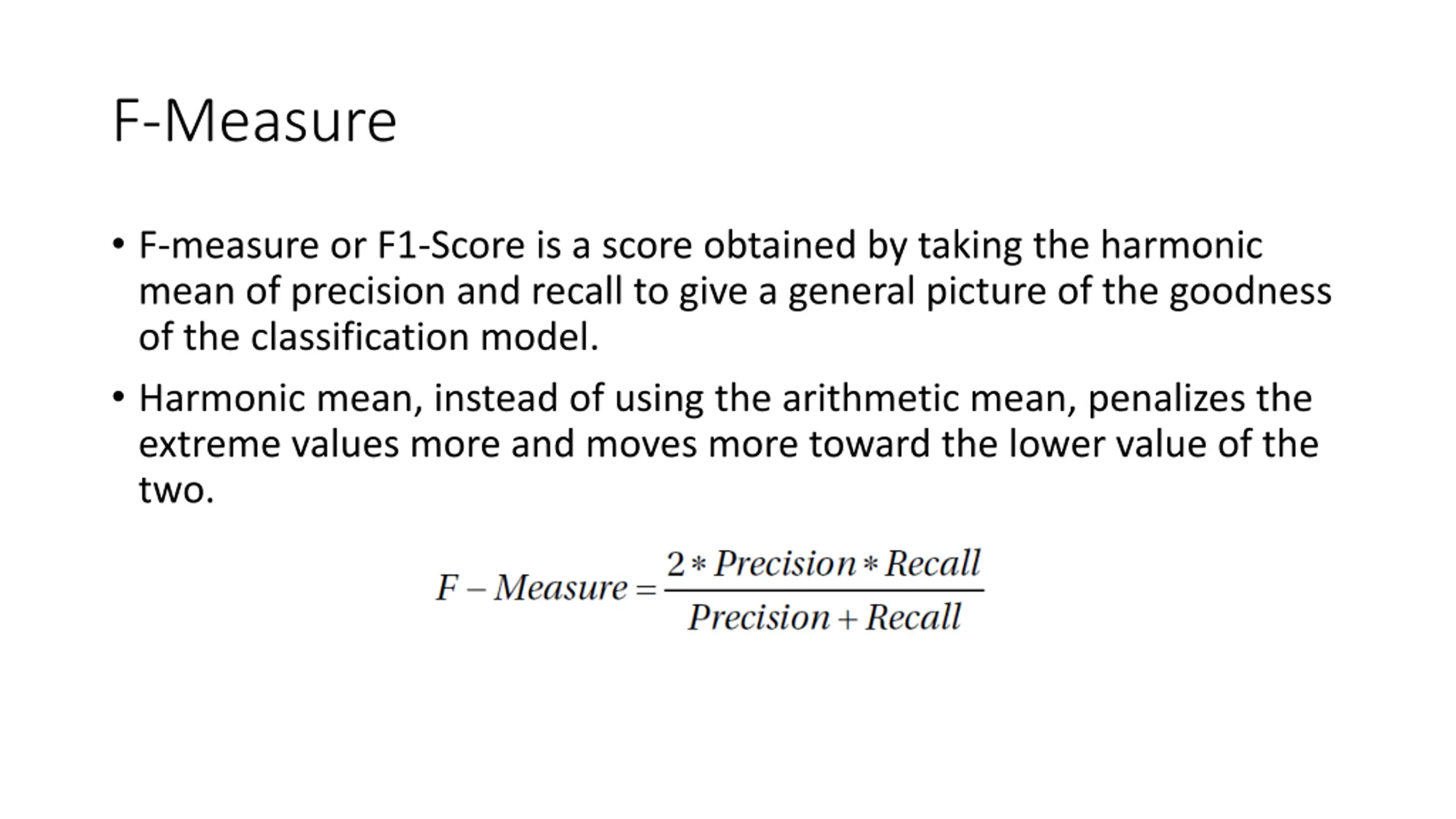F-Measure F-measure or F1-Score is a score obtained by taking the harmonic mean of precision and recall to give a general picture of the goodness of the classification model. Harmonic mean, instead of using the arithmetic mean, penalizes the extreme values more and moves more toward the lower value of the two.