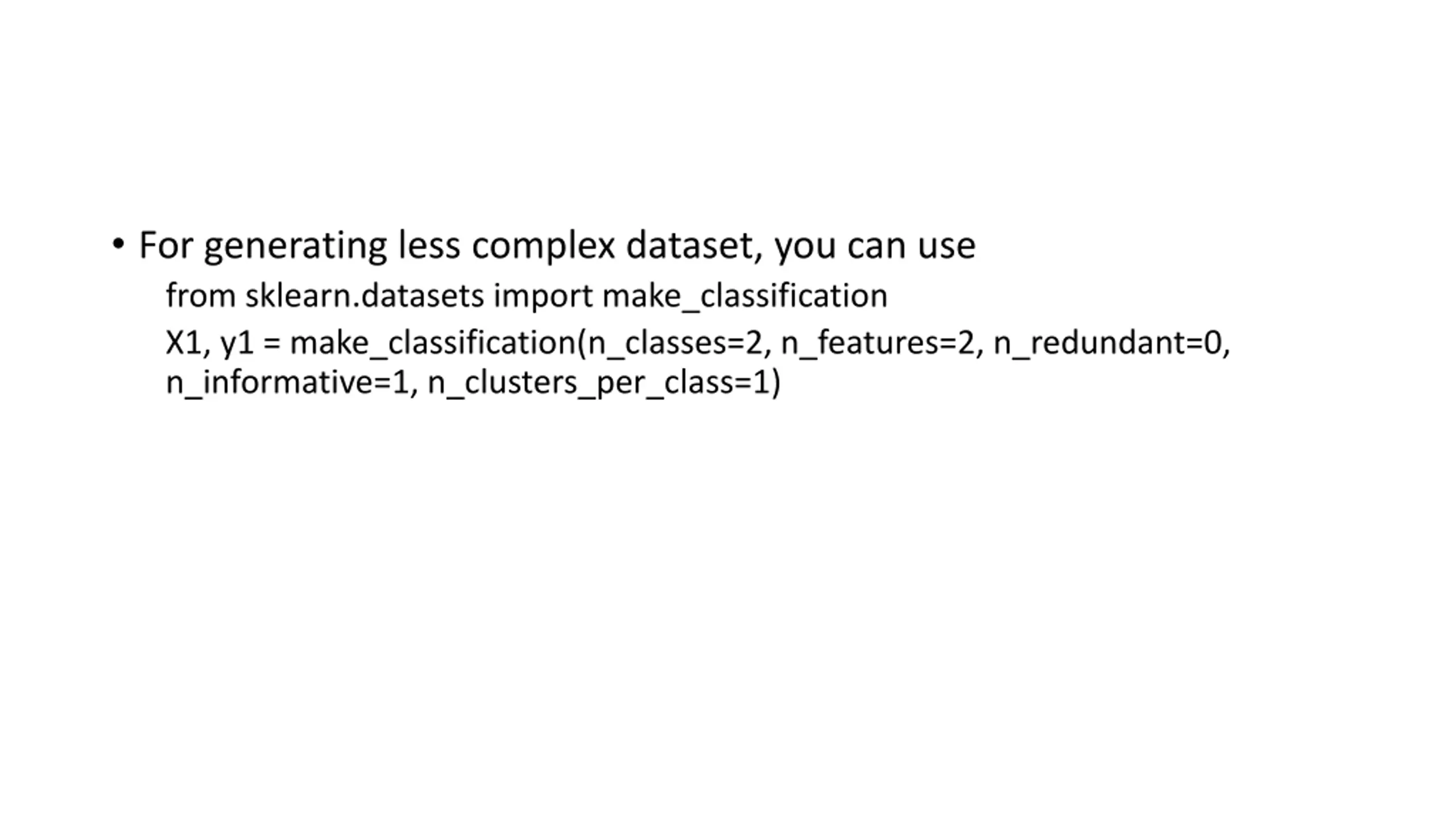 For generating less complex dataset, you can use from sklearn.datasets import make_classification X1, y1 = make_classification(n_classes=2, n_features=2, n_redundant=0, n_informative=1, n_clusters_per_class=1)