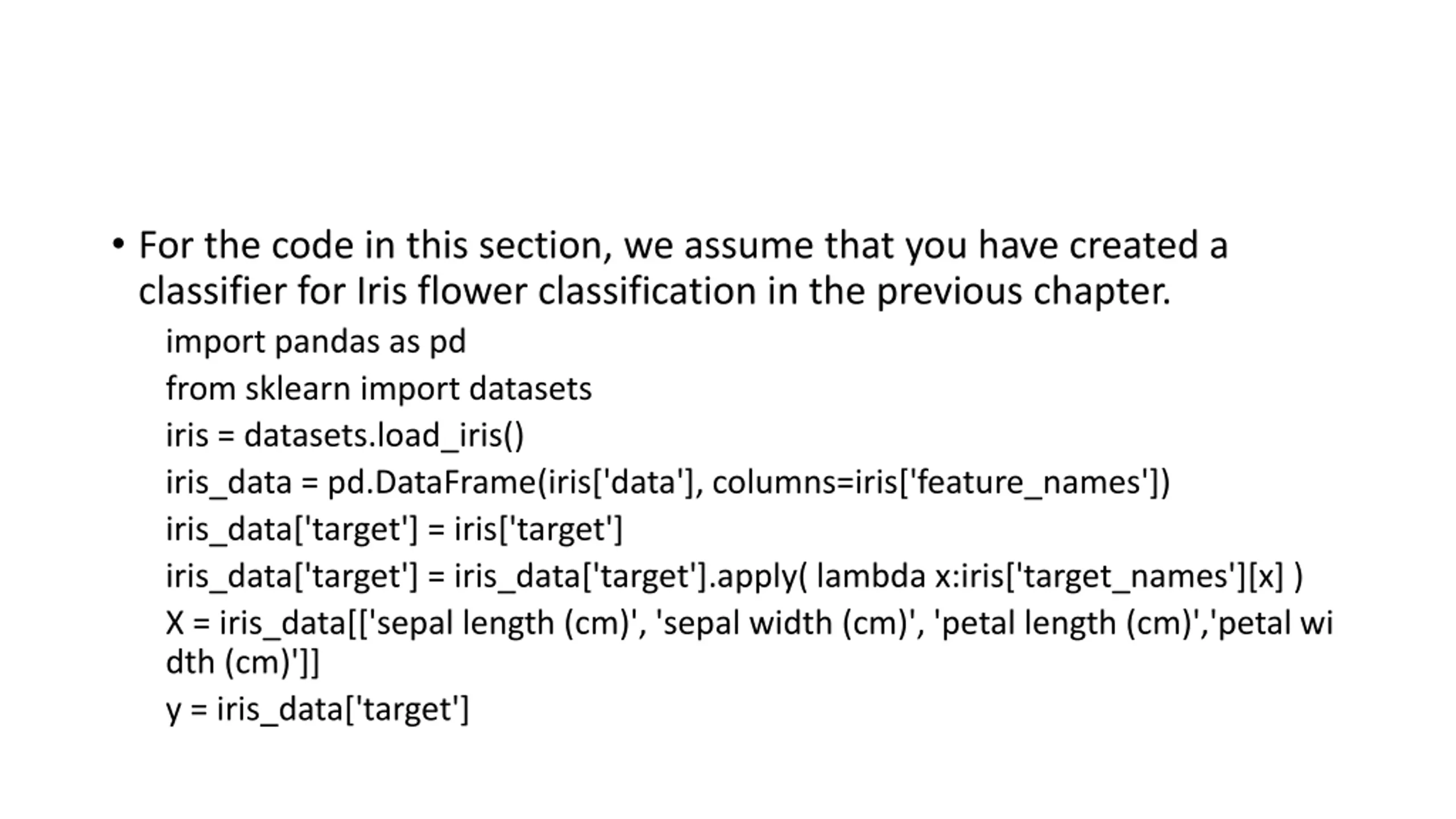 For the code in this section, we assume that you have created a classifier for Iris flower classification in the previous chapter. import pandas as pd from sklearn import datasets iris = datasets.load_iris() iris_data = pd.DataFrame(iris['data'], columns=iris['feature_names']) iris_data['target'] = iris['target'] iris_data['target'] = iris_data['target'].apply( lambda x:iris['target_names'][x] ) X = iris_data[['sepal length (cm)', 'sepal width (cm)', 'petal length (cm)','petal wi dth (cm)']] y = iris_data['target']