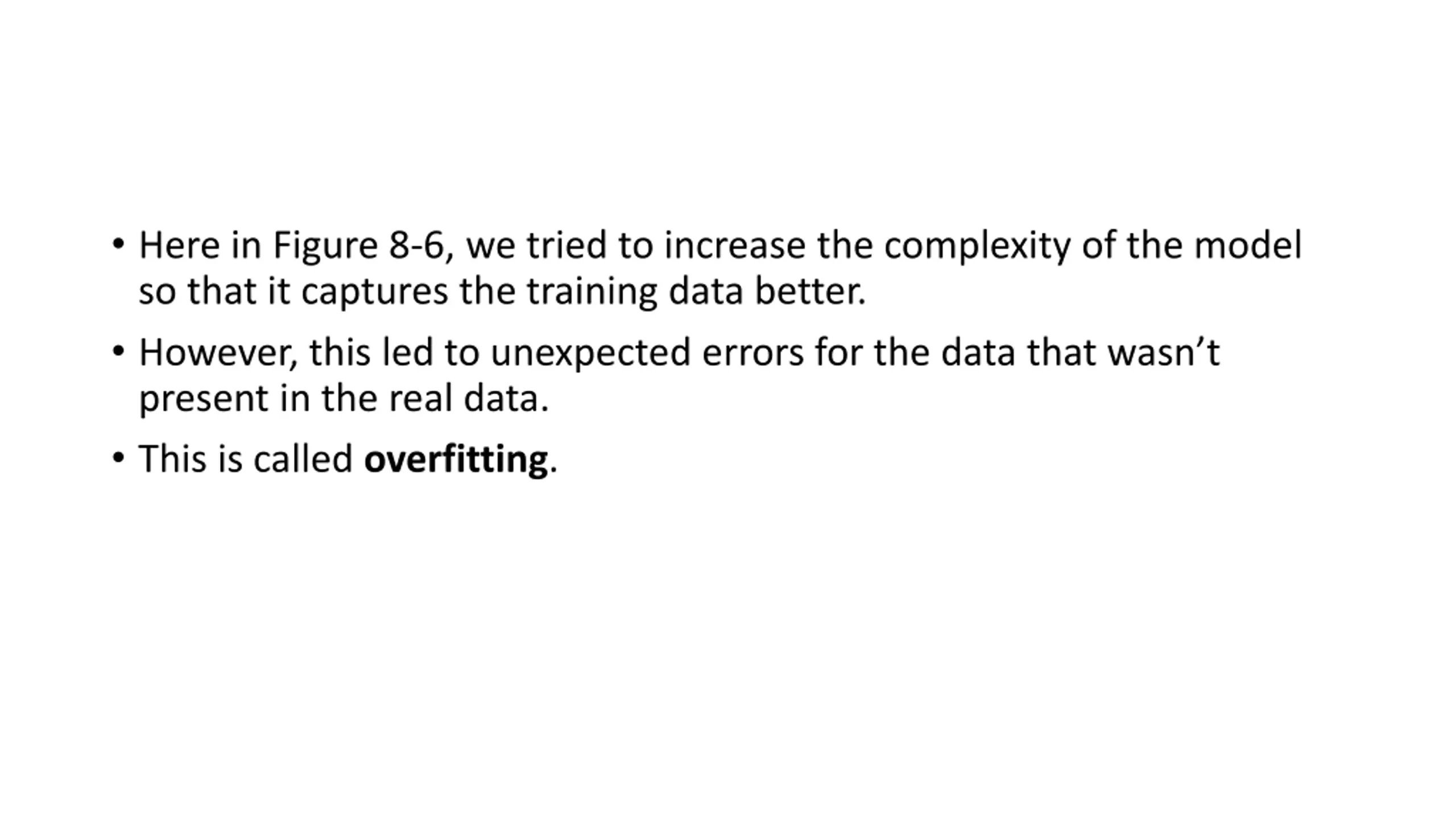 Here in Figure 8-6, we tried to increase the complexity of the model so that it captures the training data better. However, this led to unexpected errors for the data that wasn t present in the real data. This is called overfitting.