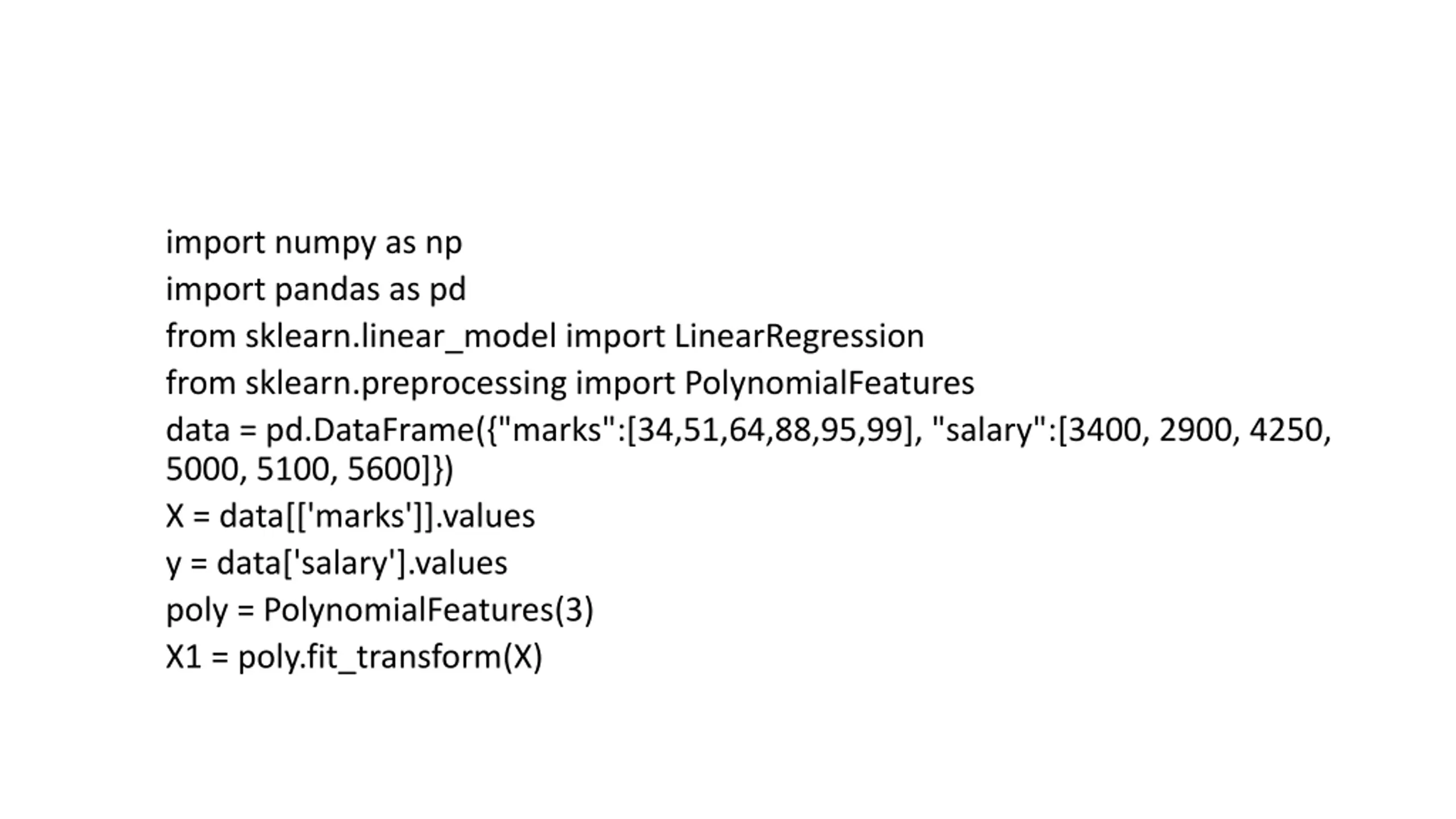 import numpy as np import pandas as pd from sklearn.linear_model import LinearRegression from sklearn.preprocessing import PolynomialFeatures data = pd.DataFrame({"marks":[34,51,64,88,95,99], "salary":[3400, 2900, 4250, 5000, 5100, 5600]}) X = data[['marks']].values y = data['salary'].values poly = PolynomialFeatures(3) X1 = poly.fit_transform(X)