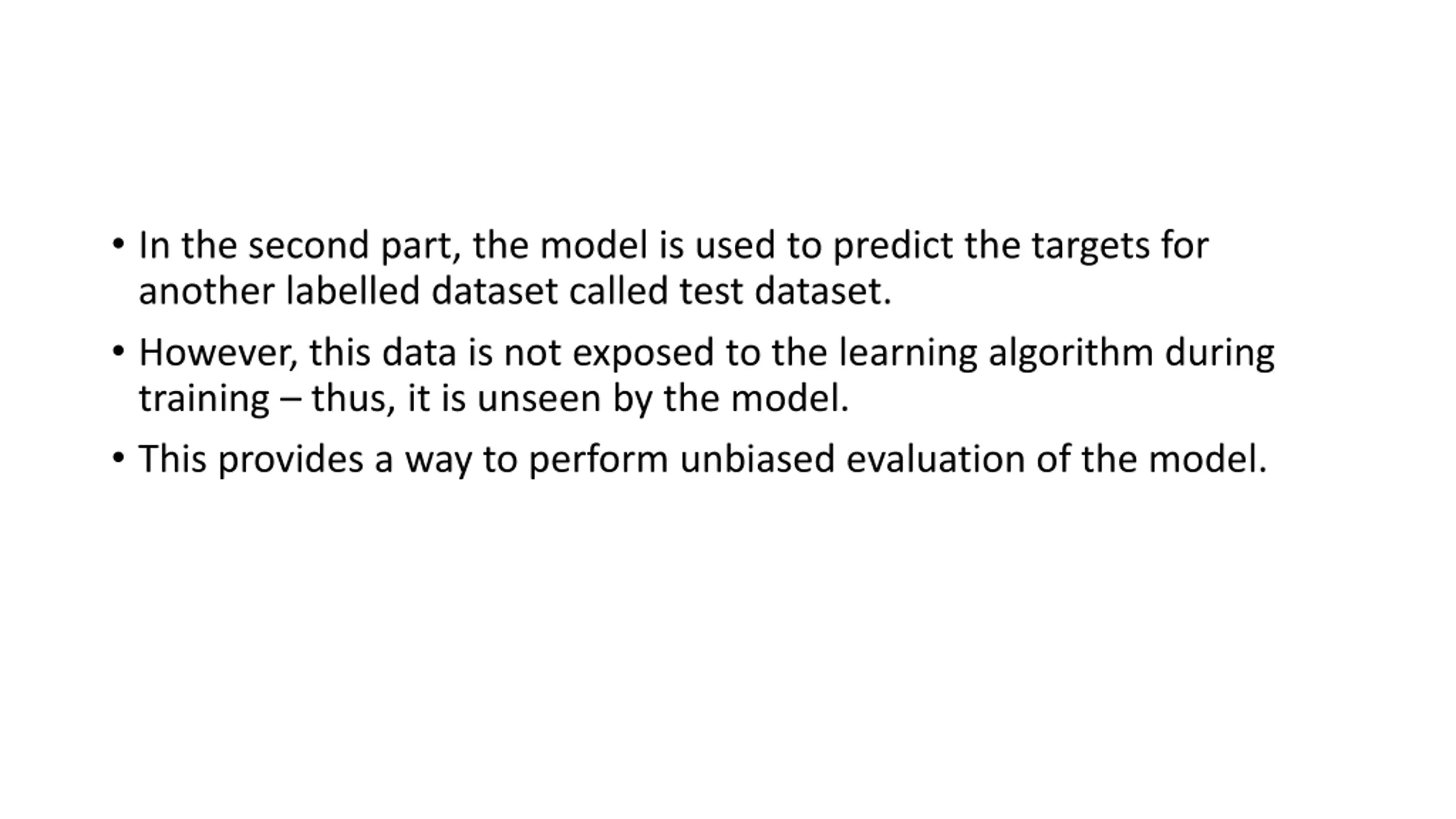 In the second part, the model is used to predict the targets for another labelled dataset called test dataset. However, this data is not exposed to the learning algorithm during training thus, it is unseen by the model. This provides a way to perform unbiased evaluation of the model.
