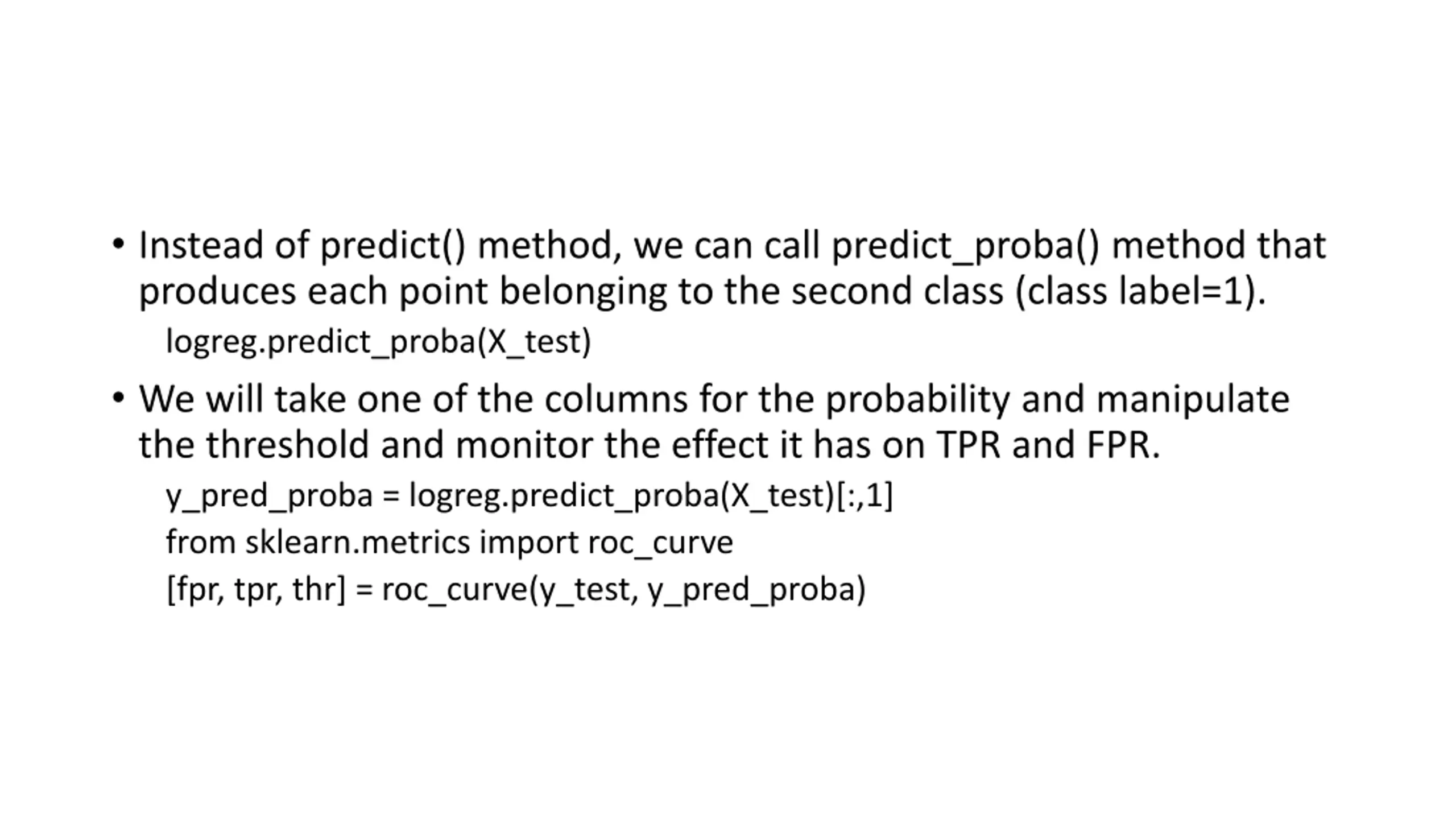 Instead of predict() method, we can call predict_proba() method that produces each point belonging to the second class (class label=1). logreg.predict_proba(X_test) We will take one of the columns for the probability and manipulate the threshold and monitor the effect it has on TPR and FPR. y_pred_proba = logreg.predict_proba(X_test)[:,1] from sklearn.metrics import roc_curve [fpr, tpr, thr] = roc_curve(y_test, y_pred_proba)