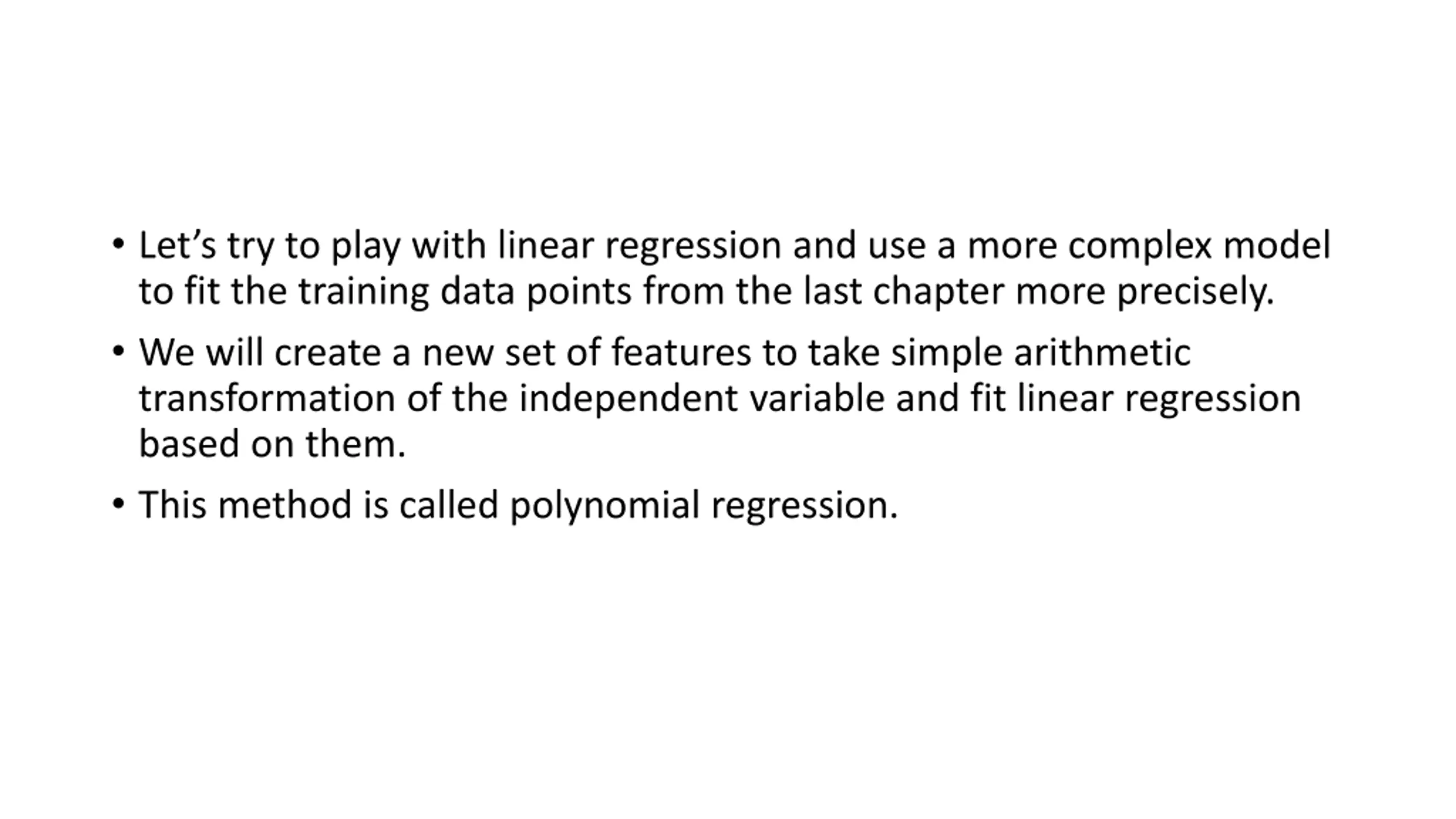Lets try to play with linear regression and use a more complex model to fit the training data points from the last chapter more precisely. We will create a new set of features to take simple arithmetic transformation of the independent variable and fit linear regression based on them. This method is called polynomial regression.