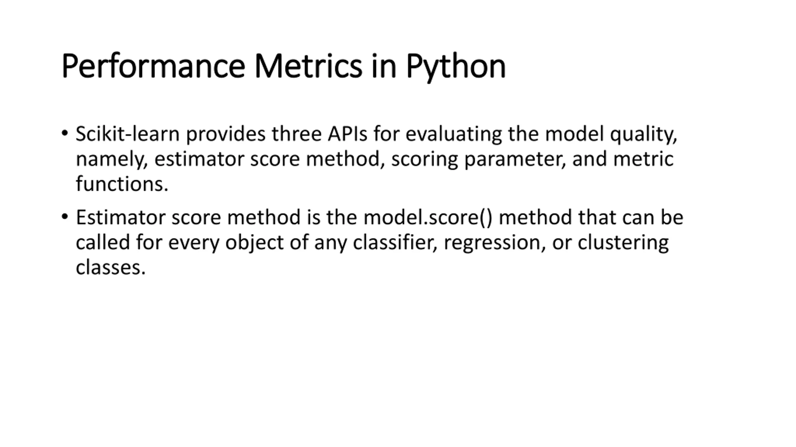 Performance Metrics in Python Performance Metrics in Python Scikit-learn provides three APIs for evaluating the model quality, namely, estimator score method, scoring parameter, and metric functions. Estimator score method is the model.score() method that can be called for every object of any classifier, regression, or clustering classes.