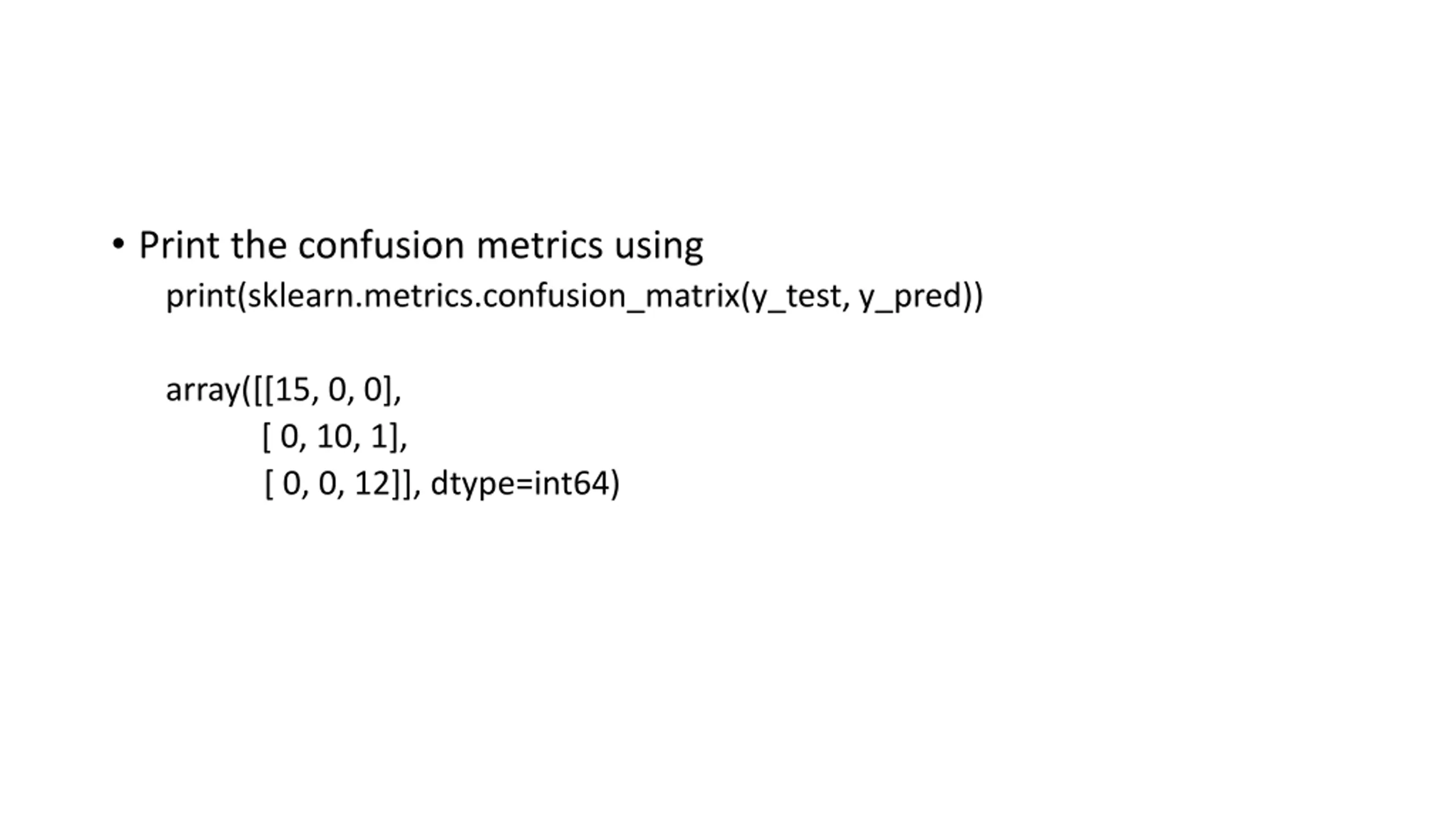 Print the confusion metrics using print(sklearn.metrics.confusion_matrix(y_test, y_pred)) array([[15, 0, 0], [ 0, 10, 1], [ 0, 0, 12]], dtype=int64)
