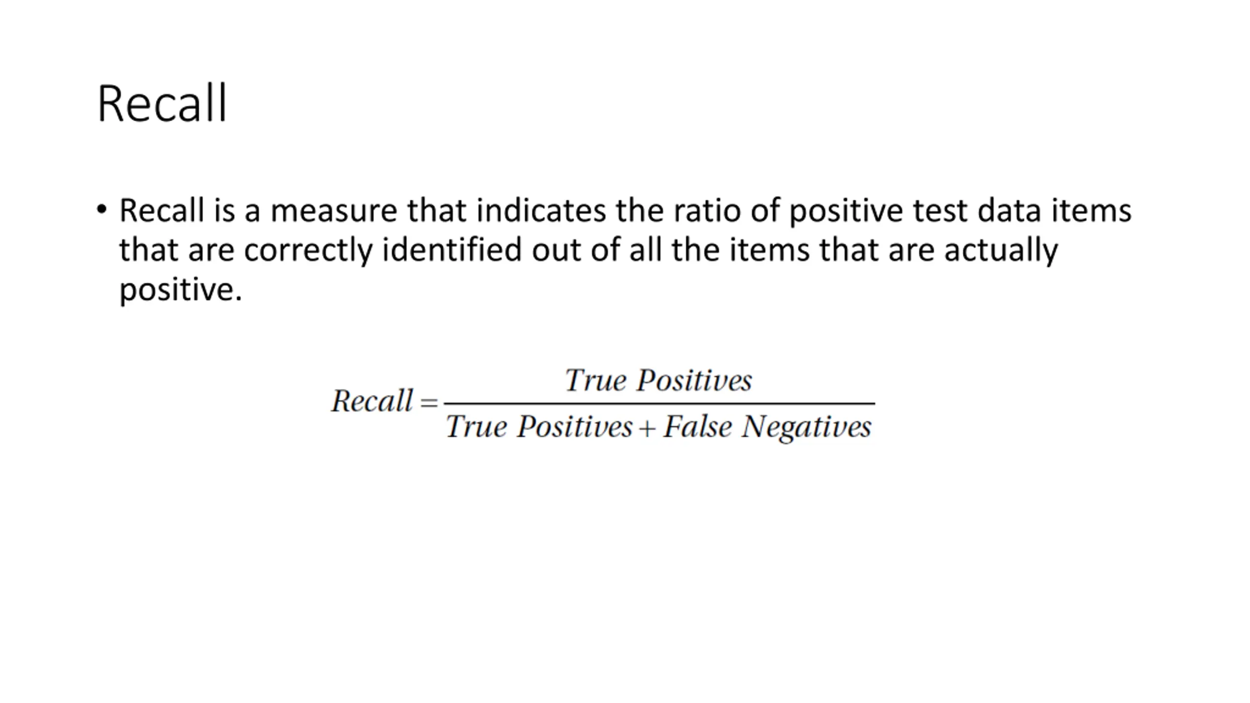 Recall Recall is a measure that indicates the ratio of positive test data items that are correctly identified out of all the items that are actually positive.