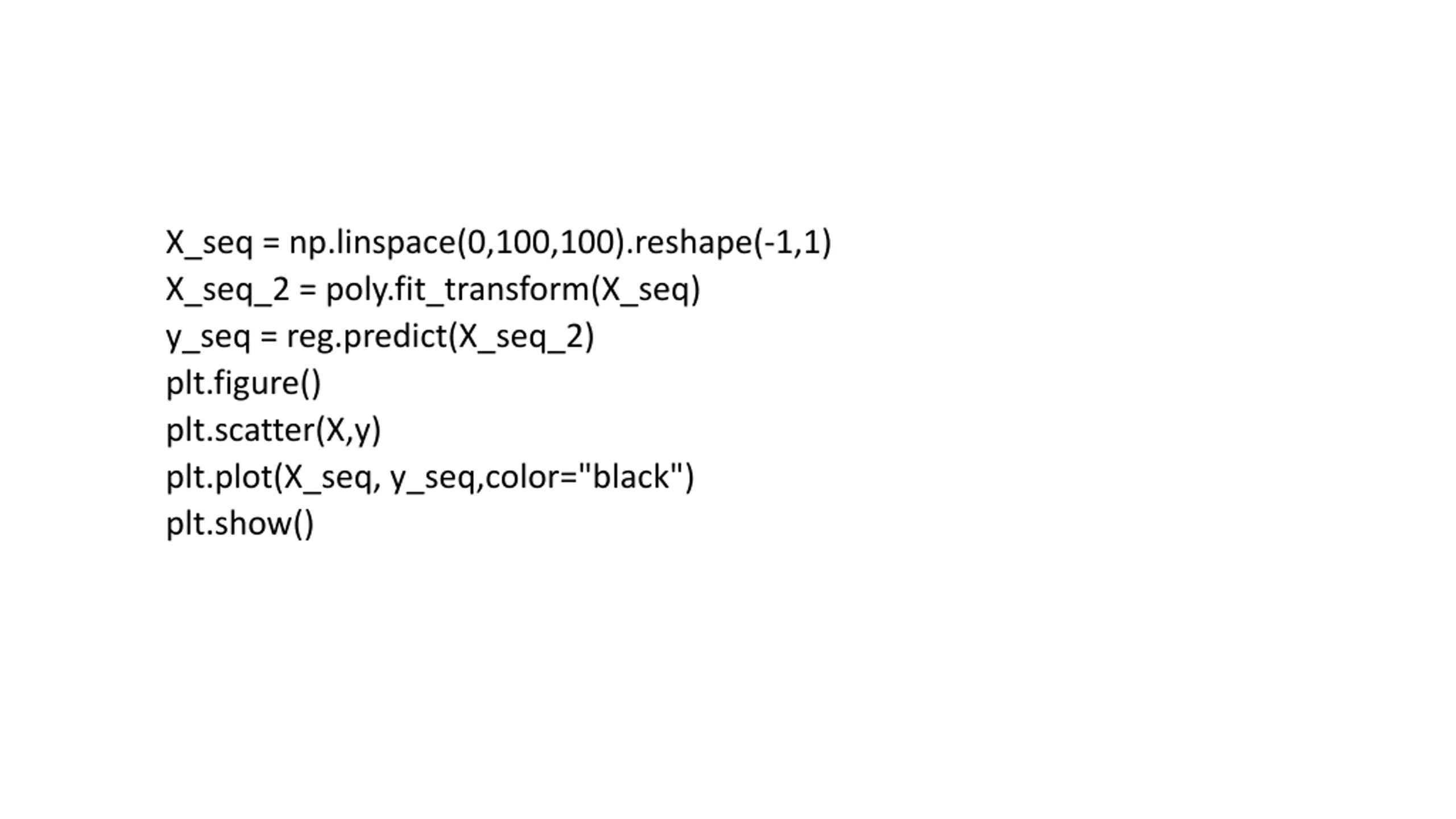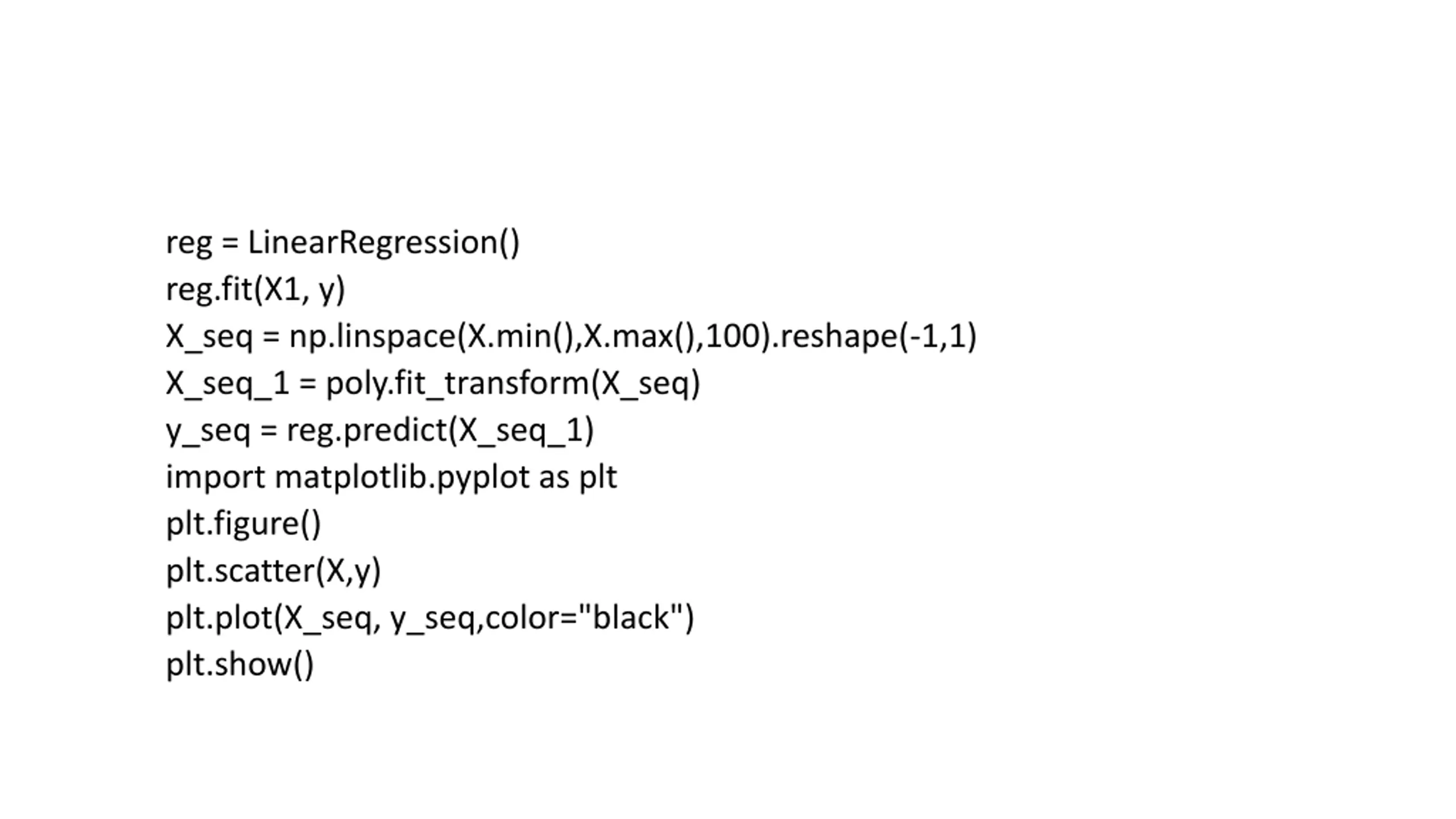 reg = LinearRegression() reg.fit(X1, y) X_seq = np.linspace(X.min(),X.max(),100).reshape(-1,1) X_seq_1 = poly.fit_transform(X_seq) y_seq = reg.predict(X_seq_1) import matplotlib.pyplot as plt plt.figure() plt.scatter(X,y) plt.plot(X_seq, y_seq,color="black") plt.show()