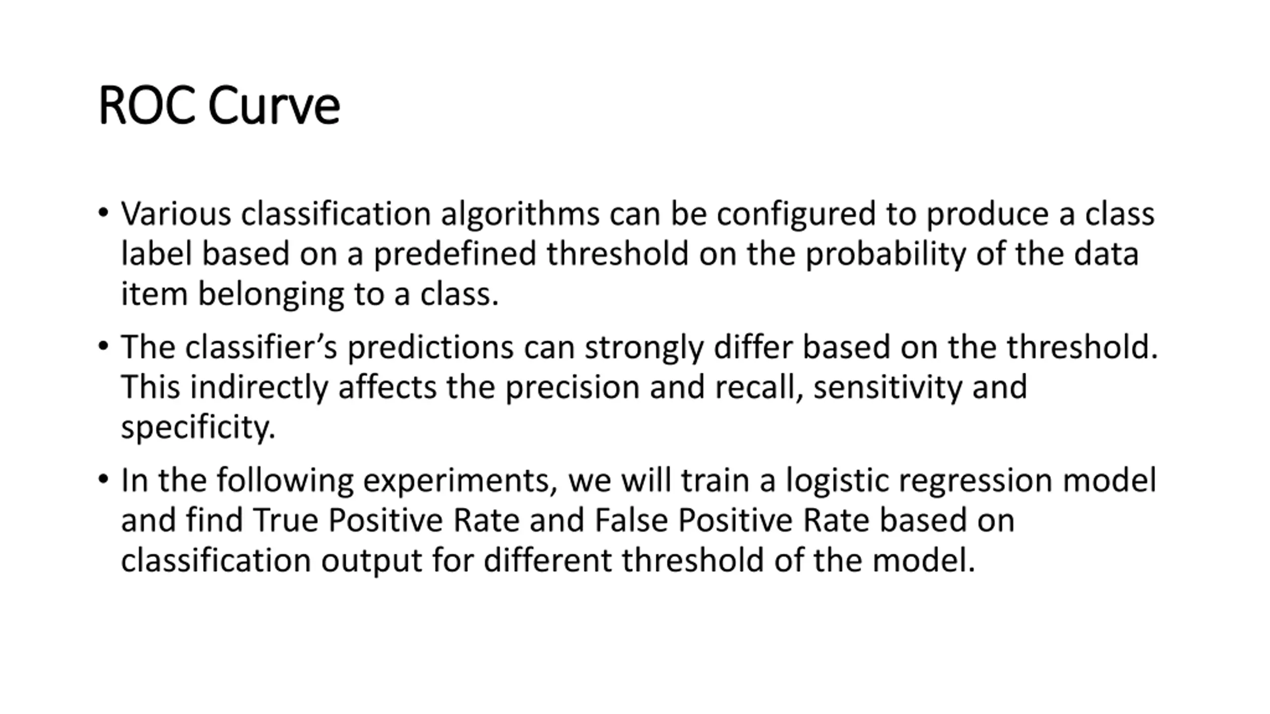 ROC Curve ROC Curve Various classification algorithms can be configured to produce a class label based on a predefined threshold on the probability of the data item belonging to a class. The classifier s predictions can strongly differ based on the threshold. This indirectly affects the precision and recall, sensitivity and specificity. In the following experiments, we will train a logistic regression model and find True Positive Rate and False Positive Rate based on classification output for different threshold of the model.