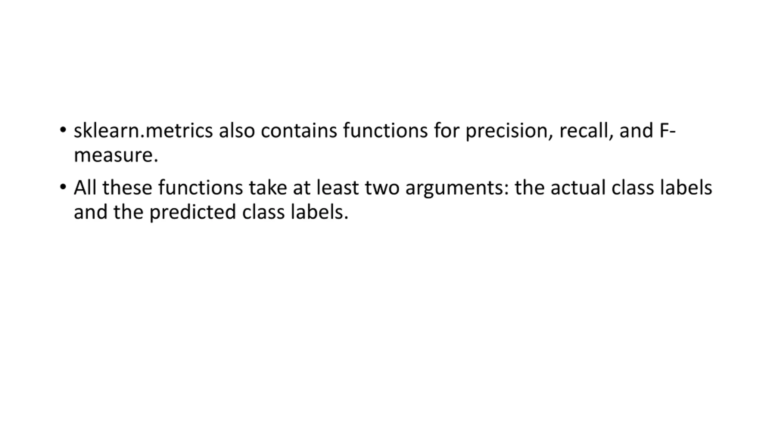 sklearn.metrics also contains functions for precision, recall, and F- measure. All these functions take at least two arguments: the actual class labels and the predicted class labels.