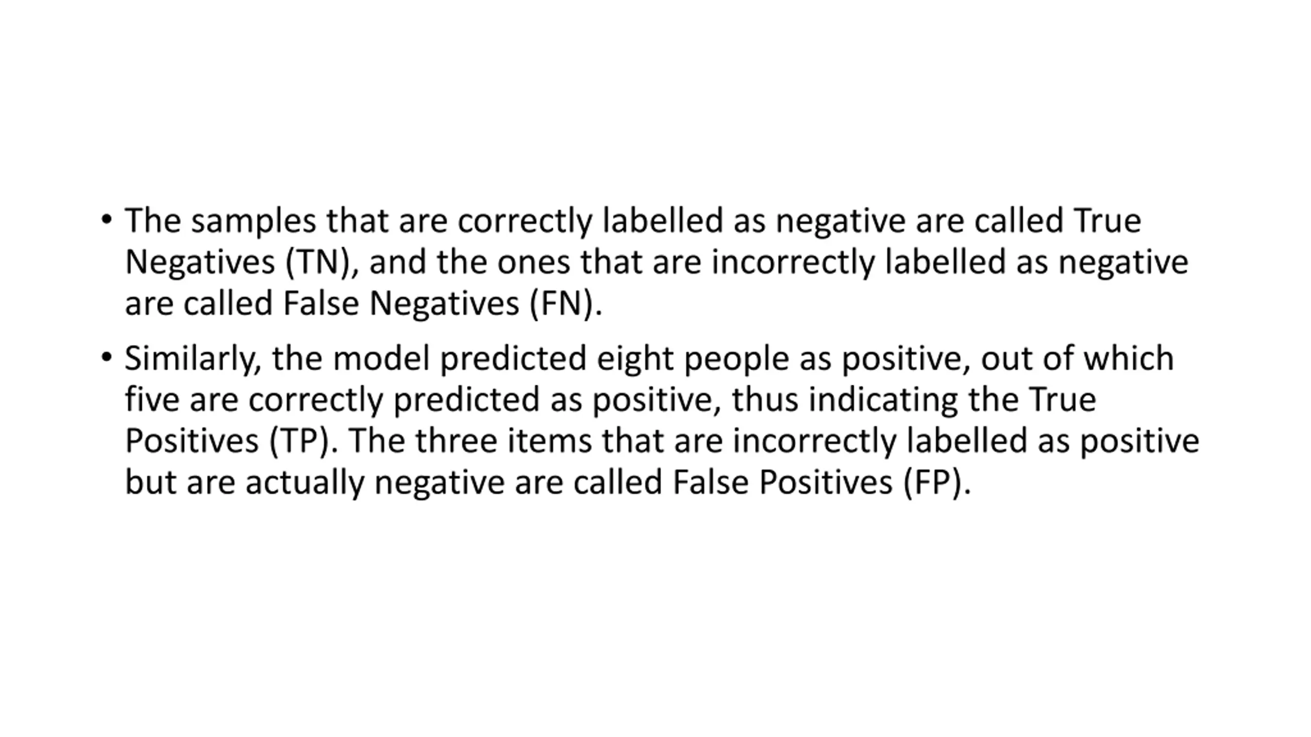 The samples that are correctly labelled as negative are called True Negatives (TN), and the ones that are incorrectly labelled as negative are called False Negatives (FN). Similarly, the model predicted eight people as positive, out of which five are correctly predicted as positive, thus indicating the True Positives (TP). The three items that are incorrectly labelled as positive but are actually negative are called False Positives (FP).