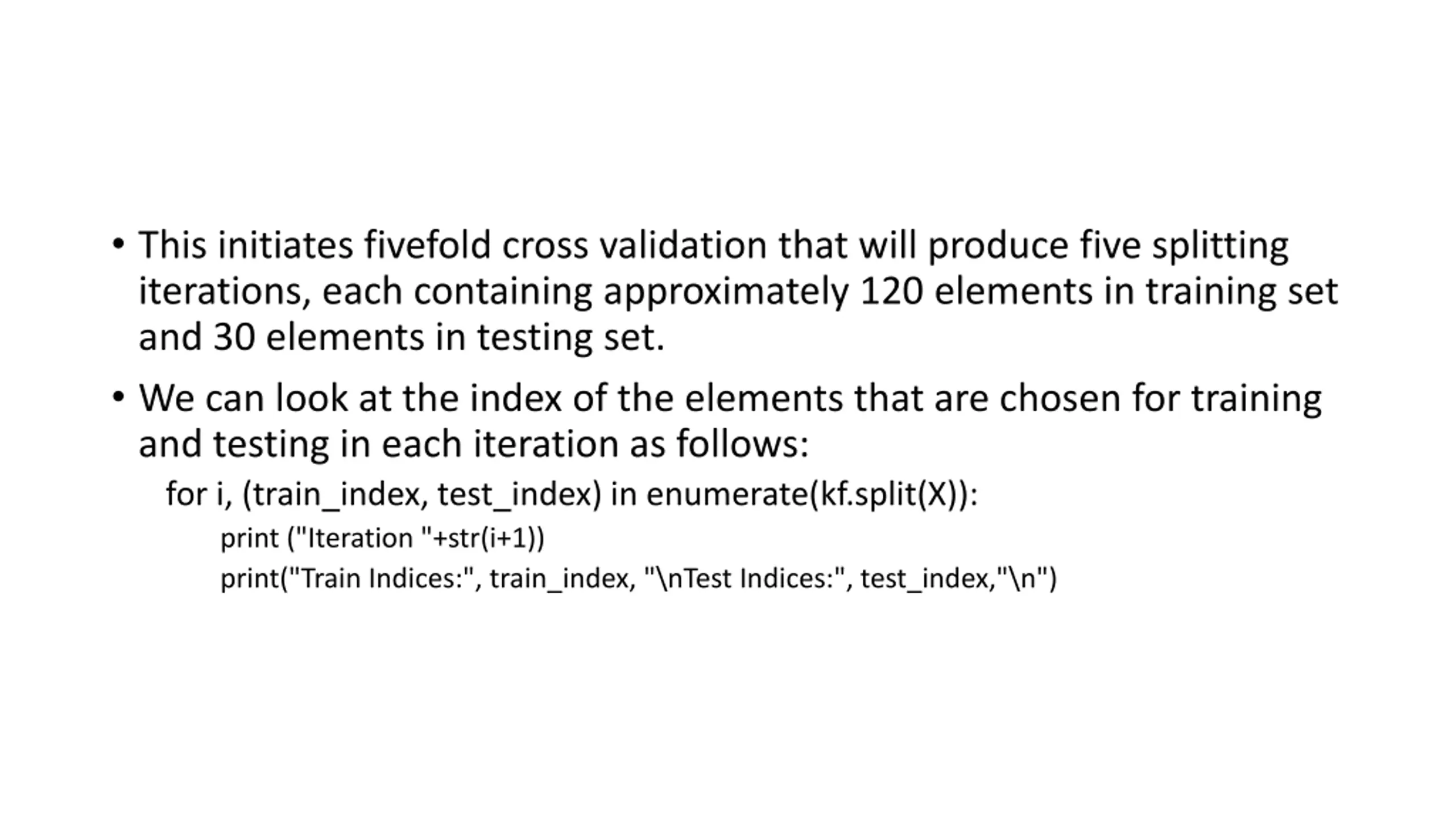 This initiates fivefold cross validation that will produce five splitting iterations, each containing approximately 120 elements in training set and 30 elements in testing set. We can look at the index of the elements that are chosen for training and testing in each iteration as follows: for i, (train_index, test_index) in enumerate(kf.split(X)): print ("Iteration "+str(i+1)) print("Train Indices:", train_index, "\nTest Indices:", test_index,"\n")