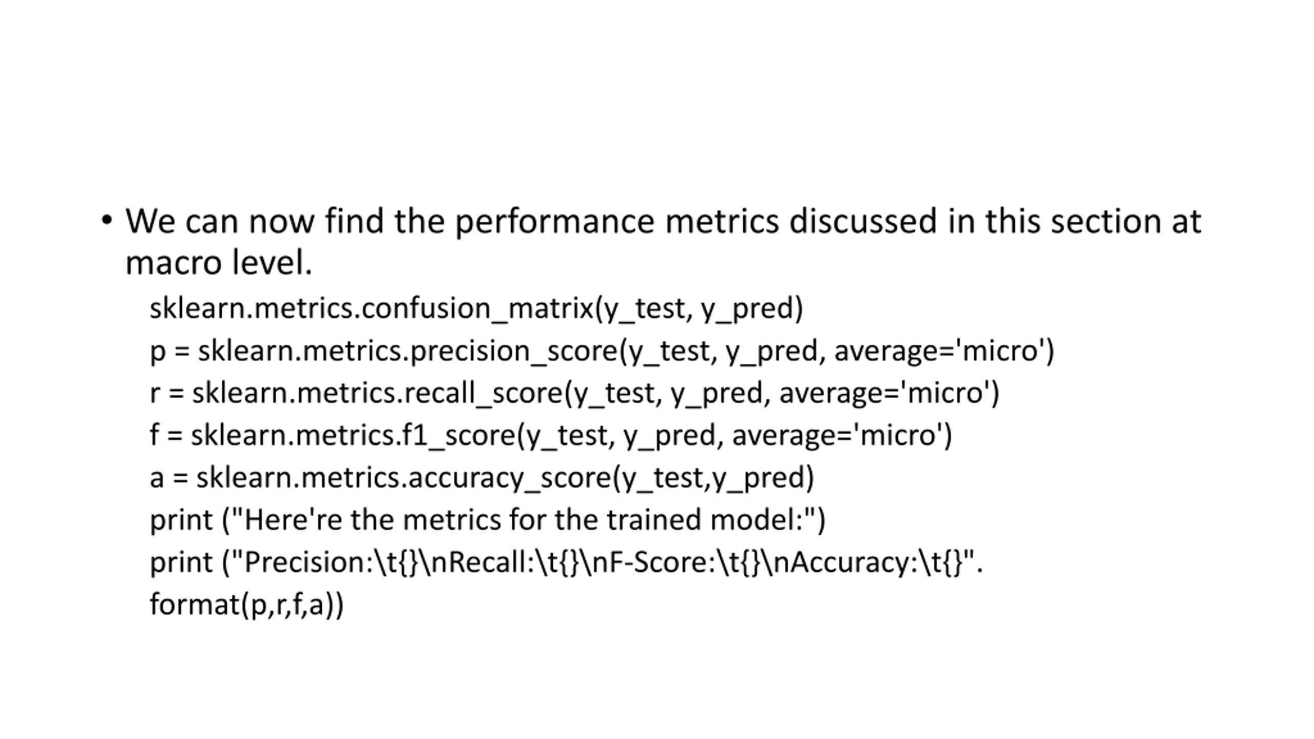 We can now find the performance metrics discussed in this section at macro level. sklearn.metrics.confusion_matrix(y_test, y_pred) p = sklearn.metrics.precision_score(y_test, y_pred, average='micro') r = sklearn.metrics.recall_score(y_test, y_pred, average='micro') f = sklearn.metrics.f1_score(y_test, y_pred, average='micro') a = sklearn.metrics.accuracy_score(y_test,y_pred) print ("Here're the metrics for the trained model:") print ("Precision:\t{}\nRecall:\t{}\nF-Score:\t{}\nAccuracy:\t{}". format(p,r,f,a))