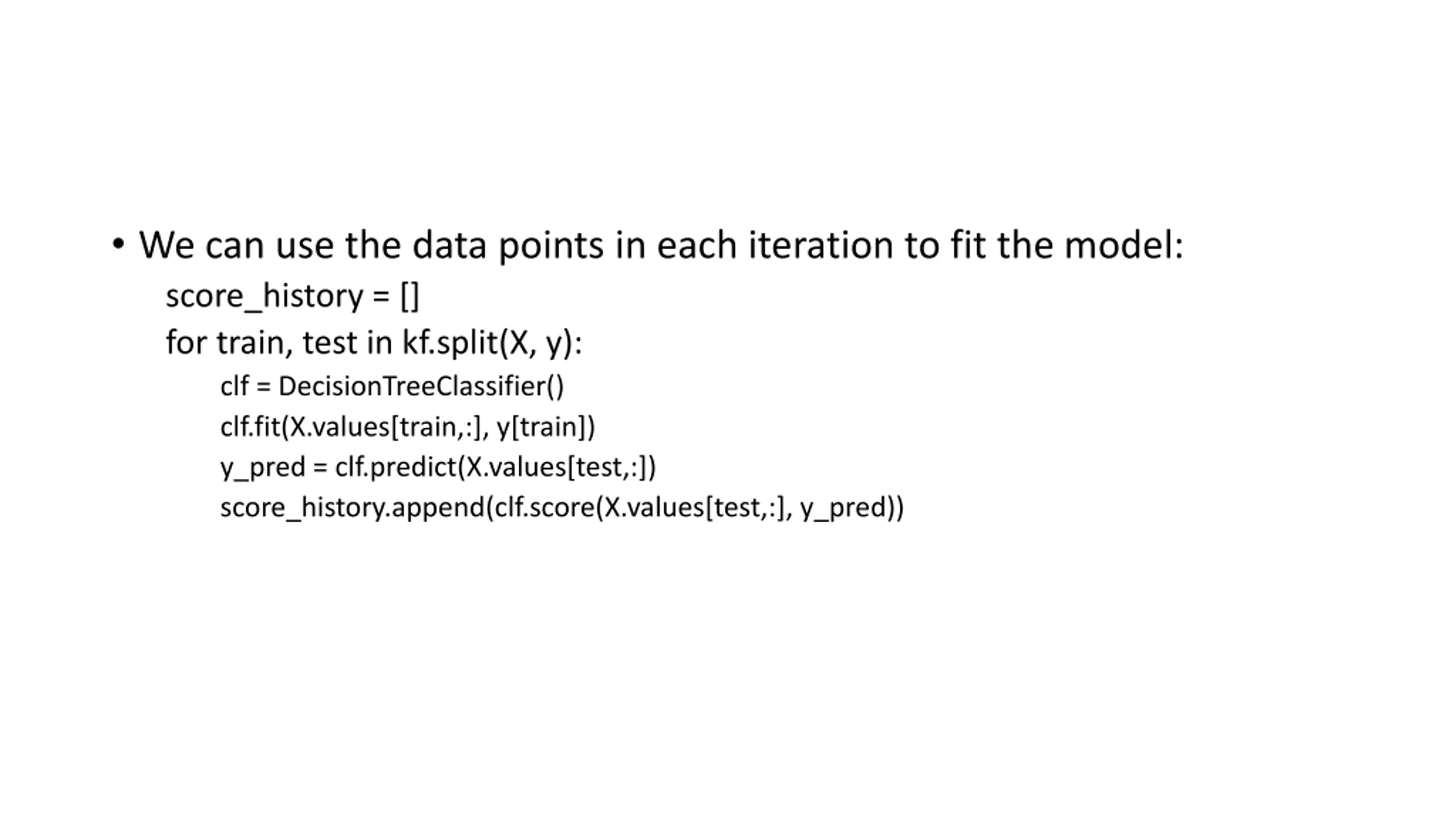 We can use the data points in each iteration to fit the model: score_history = [] for train, test in kf.split(X, y): clf = DecisionTreeClassifier() clf.fit(X.values[train,:], y[train]) y_pred = clf.predict(X.values[test,:]) score_history.append(clf.score(X.values[test,:], y_pred))