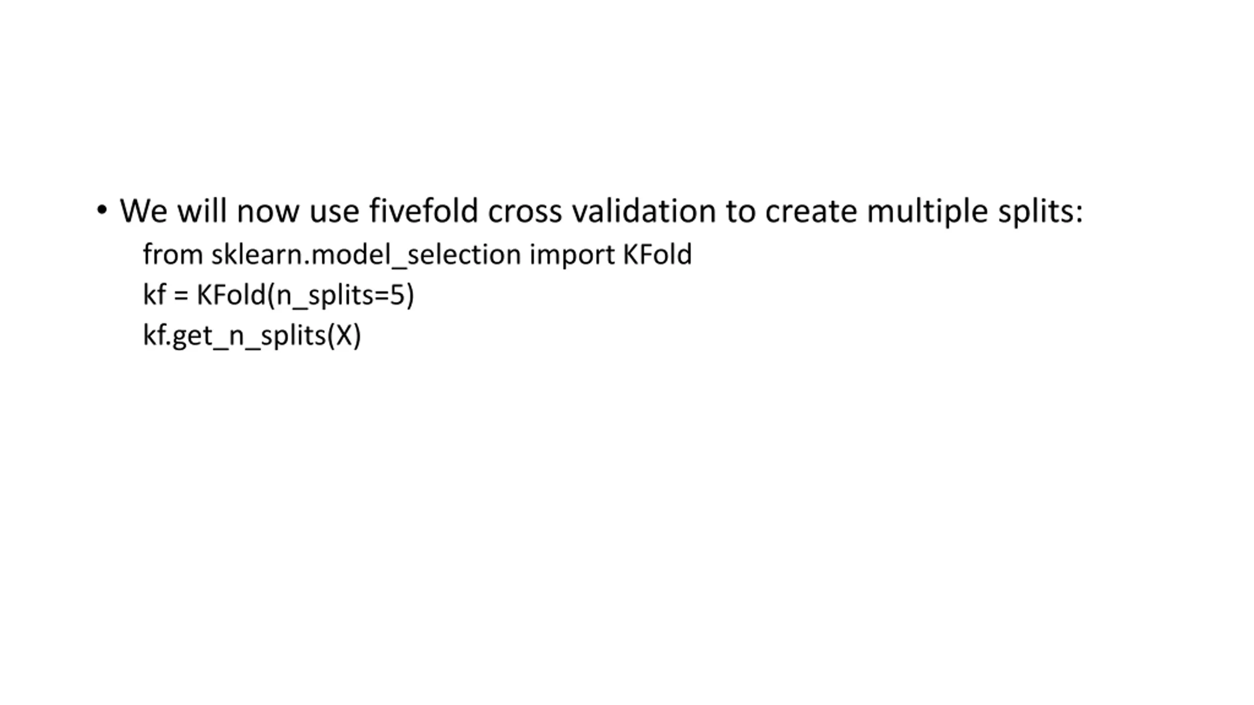We will now use fivefold cross validation to create multiple splits: from sklearn.model_selection import KFold kf = KFold(n_splits=5) kf.get_n_splits(X)