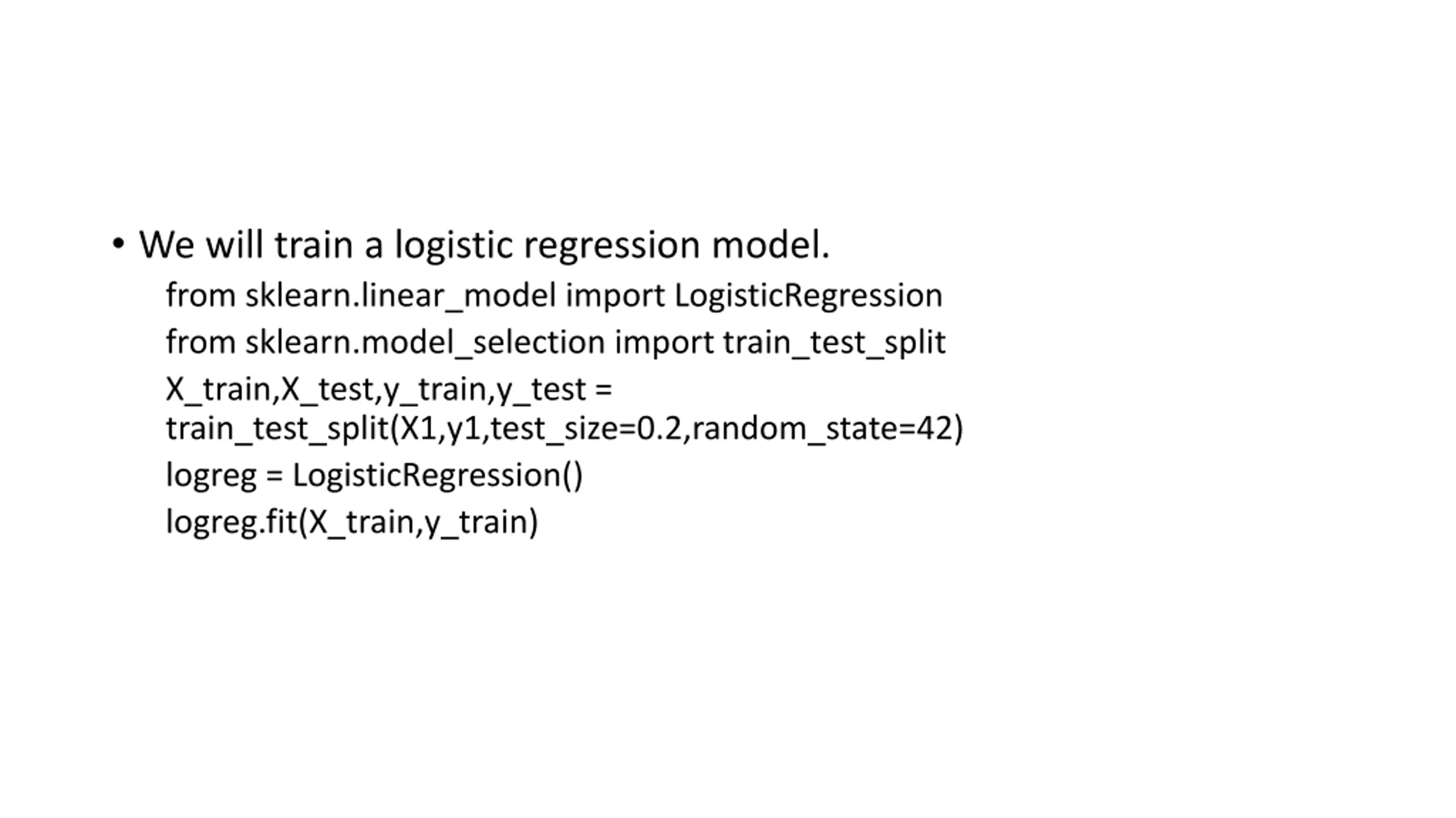 We will train a logistic regression model. from sklearn.linear_model import LogisticRegression from sklearn.model_selection import train_test_split X_train,X_test,y_train,y_test = train_test_split(X1,y1,test_size=0.2,random_state=42) logreg = LogisticRegression() logreg.fit(X_train,y_train)