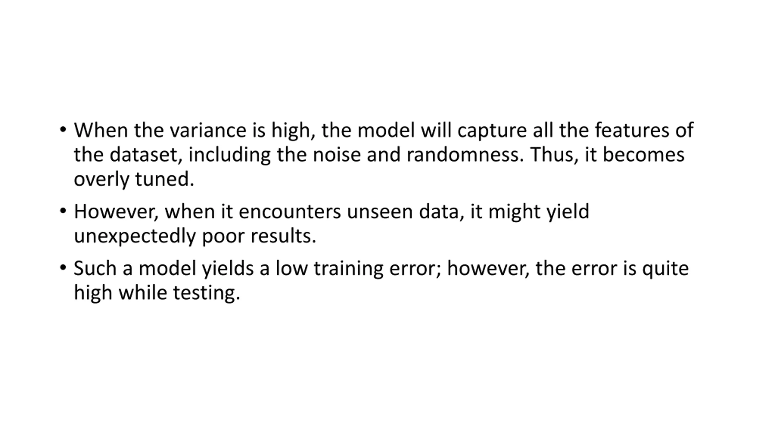 When the variance is high, the model will capture all the features of the dataset, including the noise and randomness. Thus, it becomes overly tuned. However, when it encounters unseen data, it might yield unexpectedly poor results. Such a model yields a low training error; however, the error is quite high while testing.