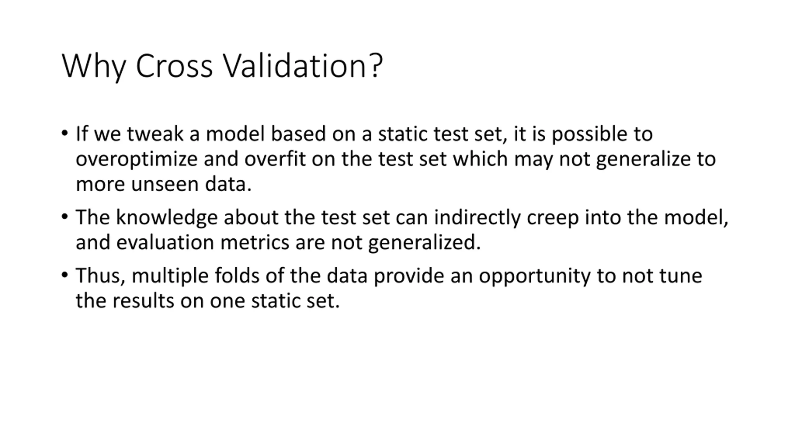 Why Cross Validation? If we tweak a model based on a static test set, it is possible to overoptimize and overfit on the test set which may not generalize to more unseen data. The knowledge about the test set can indirectly creep into the model, and evaluation metrics are not generalized. Thus, multiple folds of the data provide an opportunity to not tune the results on one static set.