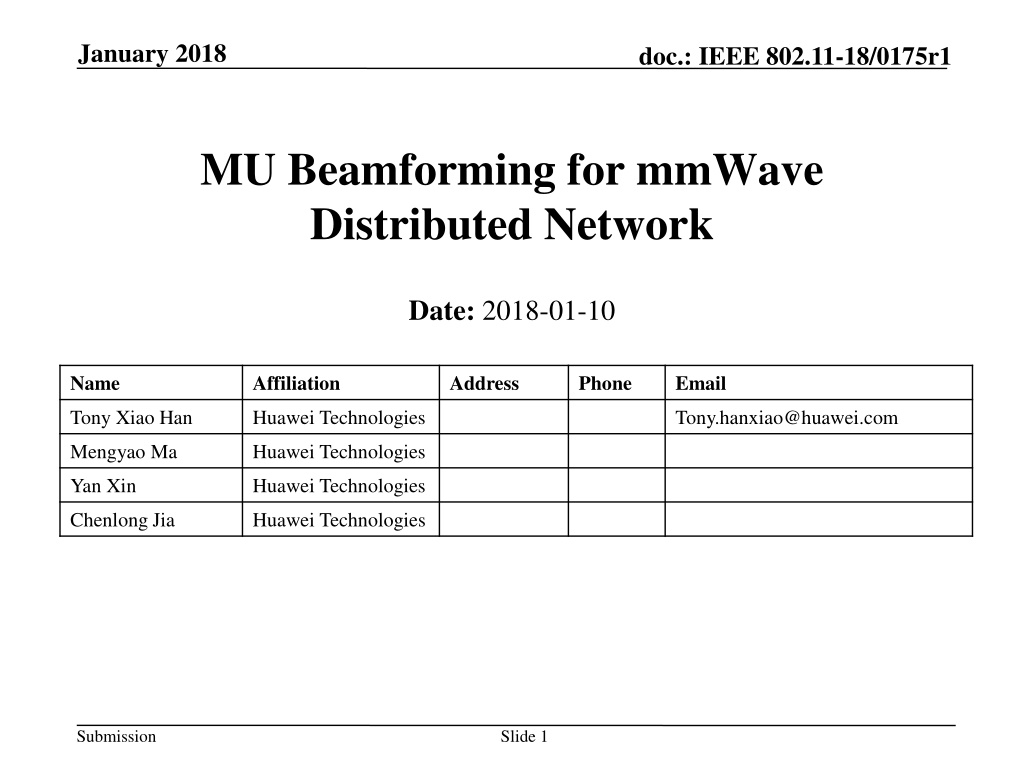 January 2018 doc.: IEEE 802.11-18/0175r1 MU Beamforming for mmWave Distributed Network Date: 2018-01-10 Name Affiliation Address Phone Email Tony Xiao Han Huawei Technologies Tony.hanxiao@huawei.com Mengyao Ma Huawei Technologies Yan Xin Huawei Technologies Chenlong Jia Huawei Technologies Submission Slide 1