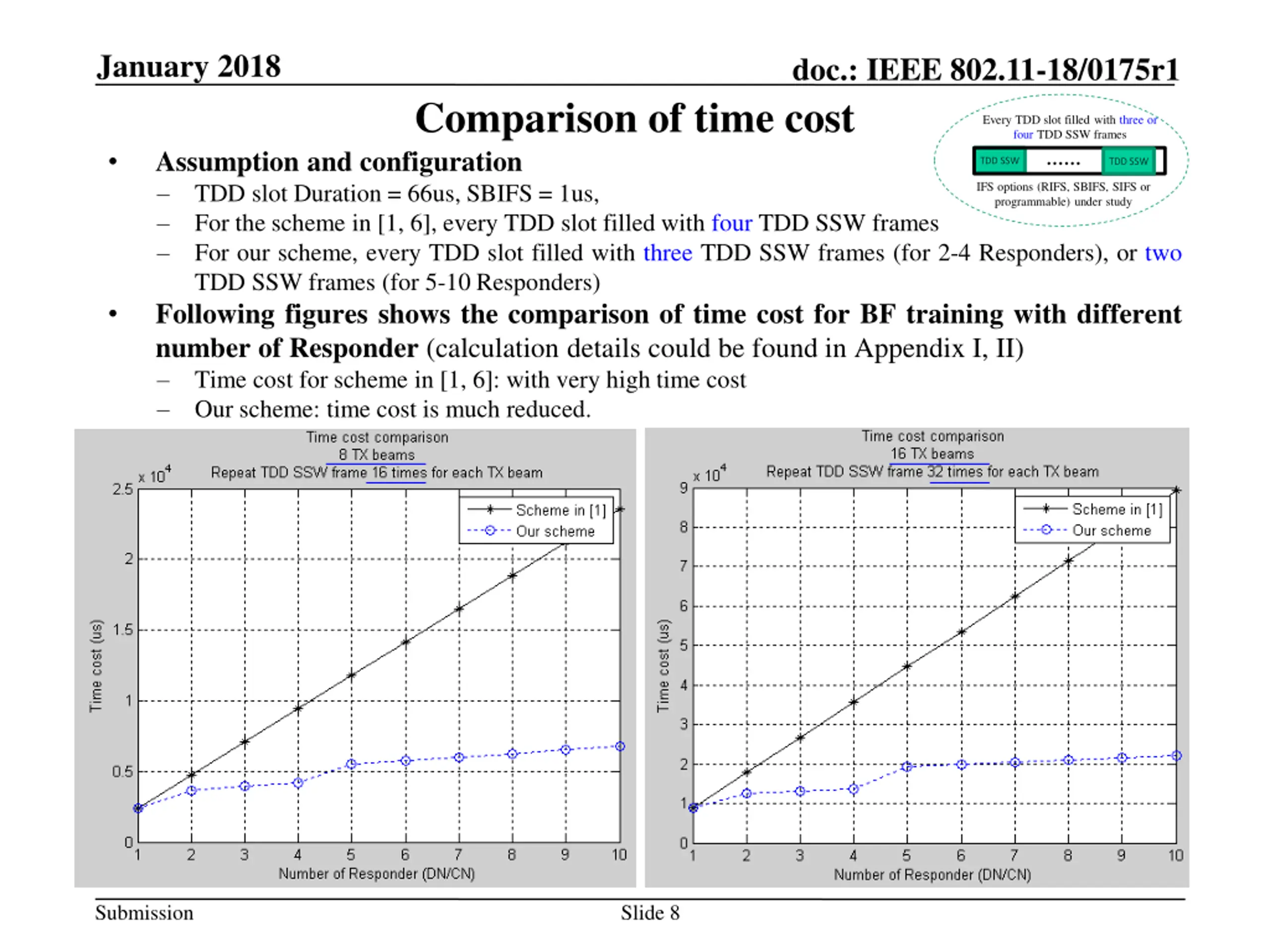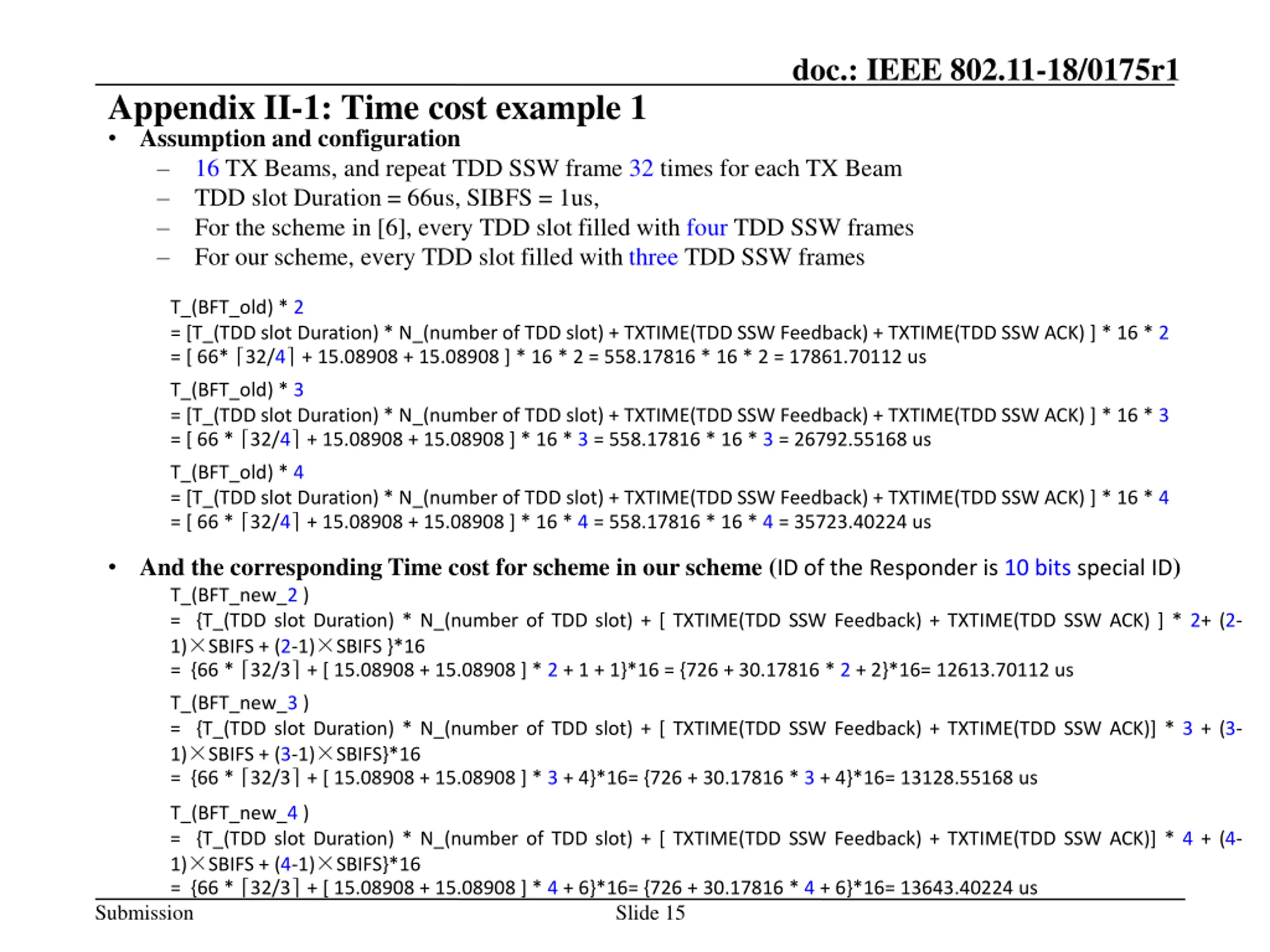 doc.: IEEE 802.11-18/0175r1 Appendix I-1: TXTIME(X) [4] TXTIME (20.12.3 TXTIME calculation in [4]) TXTIME(TDD SSW_old) =?_(??? ??)+?_(?? ??)+(11 8+(????? 6) 8+?_?? 168) ?_? 32+?_??? ?_(??? ????) =3.636us+655ns+(11 8+(27-6) 8+2 168) 0.57ns 32 = 15.08908us (SSW is 14.94316us) TXTIME(TDD SSW_new) (when use 10 bit ID of Responder) =?_(??? ??)+?_(?? ??)+(11 8+(????? 6) 8+?_?? 168) ?_? 32+?_??? ?_(??? ????) =3.636us+655ns+(11 8+( 34 -6) 8+ 3 168) 0.57ns 32 = 19.17484 us (when used for 2 Responders) =3.636us+655ns+(11 8+(38 -6) 8+ 3 168) 0.57ns 32 = 19.75852 us (when used for 3 Responders) =3.636us+655ns+(11 8+( 42 -6) 8+ 3 168) 0.57ns 32 = 20.3422 us (when used for 4 Responders) TXTIME(TDD SSW Feedback) =?_(??? ??)+?_(?? ??)+(11 8+(????? 6) 8+?_?? 168) ?_? 32+?_??? ?_(??? ????) =3.636us+655ns+(11 8+(27-6) 8+2 168) 0.57ns 32 = 15.08908us (SSW is 14.94316us) TXTIME(TDD SSW ACK) =?_(??? ??)+?_(?? ??)+(11 8+(????? 6) 8+?_?? 168) ?_? 32+?_??? ?_(??? ????) =3.636us+655ns+(11 8+(27-6) 8+2 168) 0.57ns 32 = 15.08908us (SSW is 14.94316us) ?_(??? ??)=3.636 s =50 Tseq ?_(?? ??)=655 ns=9 Tseq The total (header and additional data) number of bits in the first LDPC codeword is LDPFCW =(LHDR + LFDCW ) 8= 88 168 is the maximal number of data bits in each LDPC codeword NCW: the number of LDPC codeword. For the SSW frame, Length=26 Octets, So ?_??=2 , ?_???=0 32 is the golay sequence spreading ?_???=168 , Length=26 Bytes Tc: SC Chip Time, i.e., 0.57ns=1/Fc Submission Slide 14