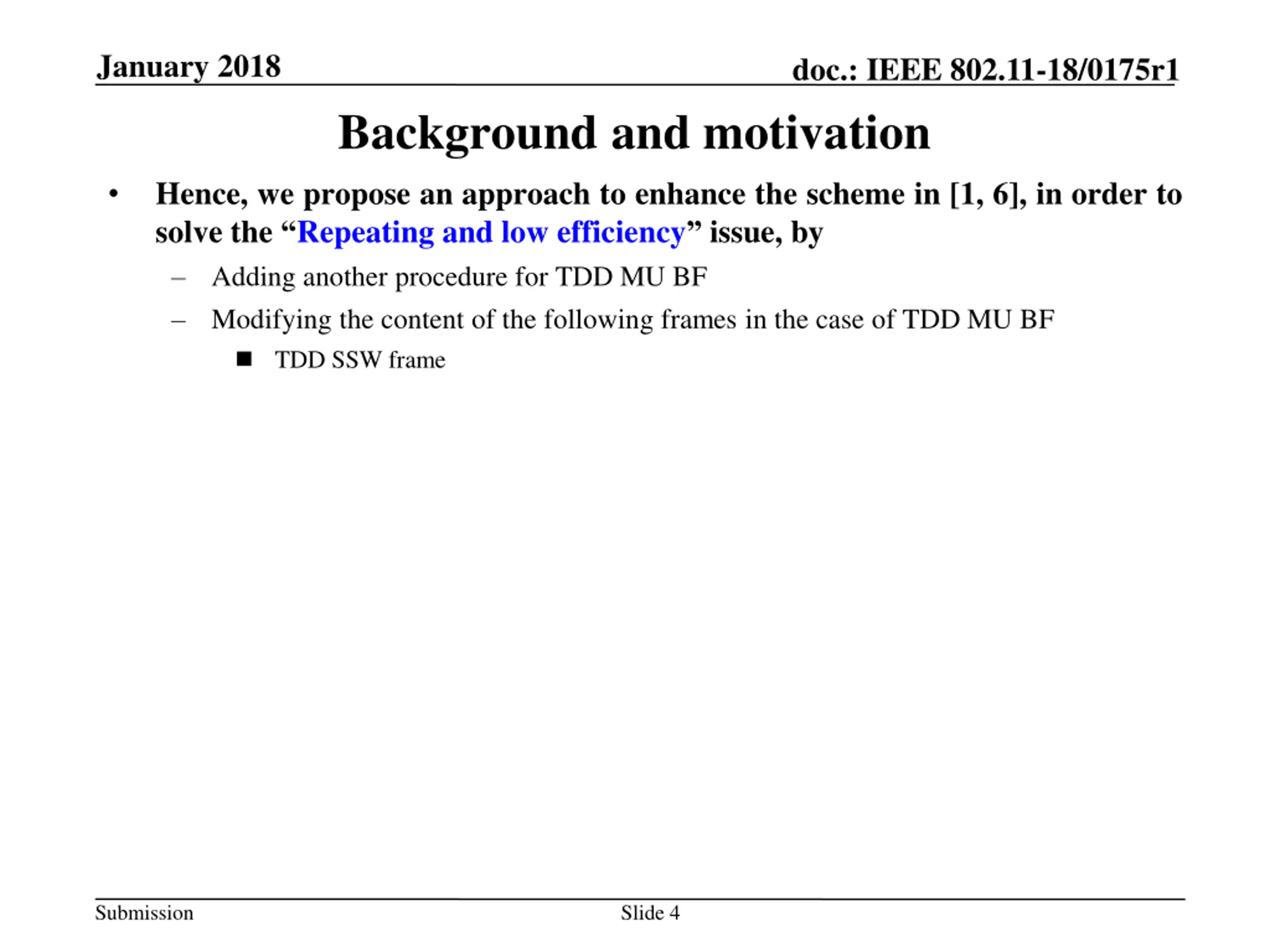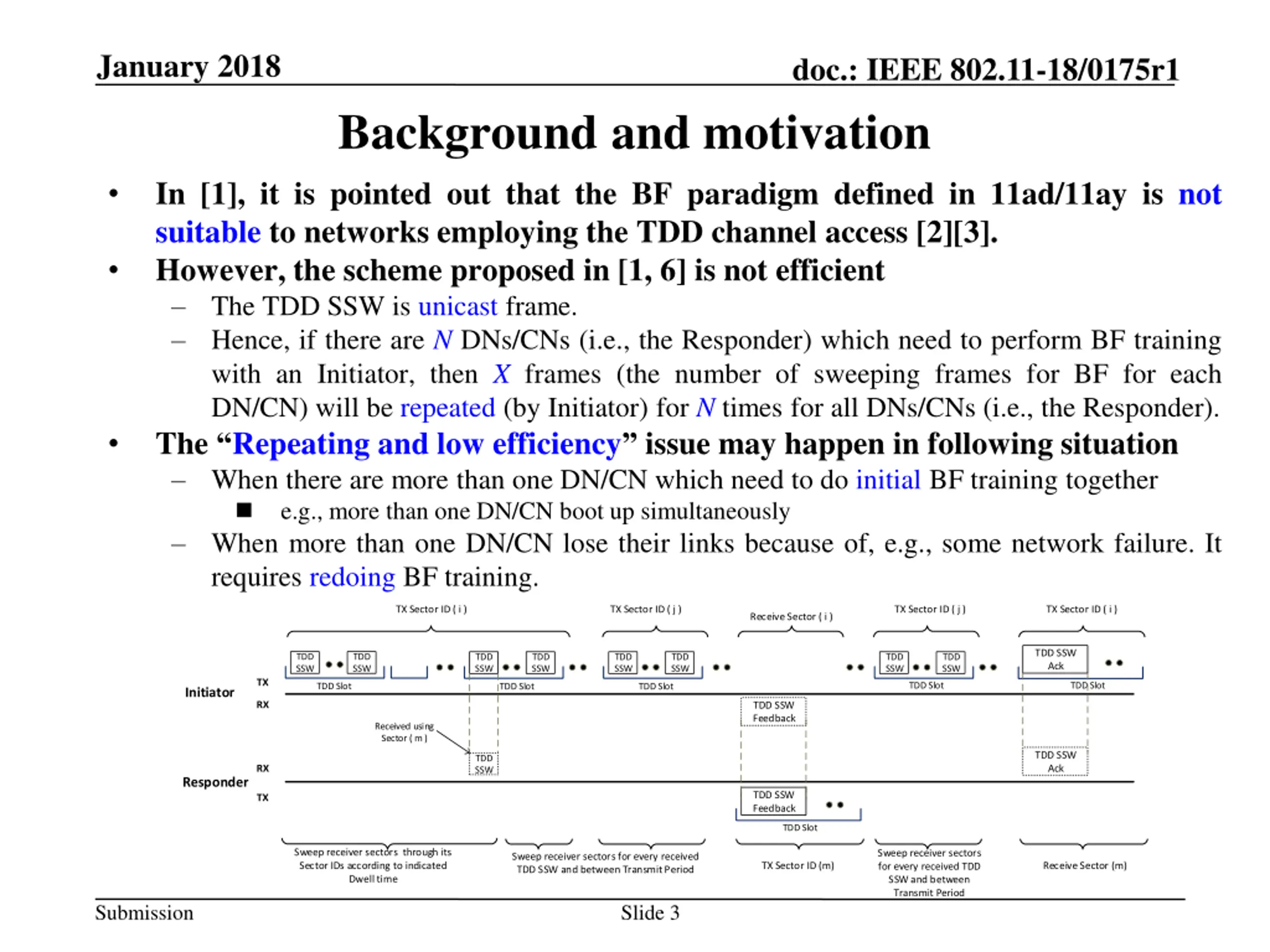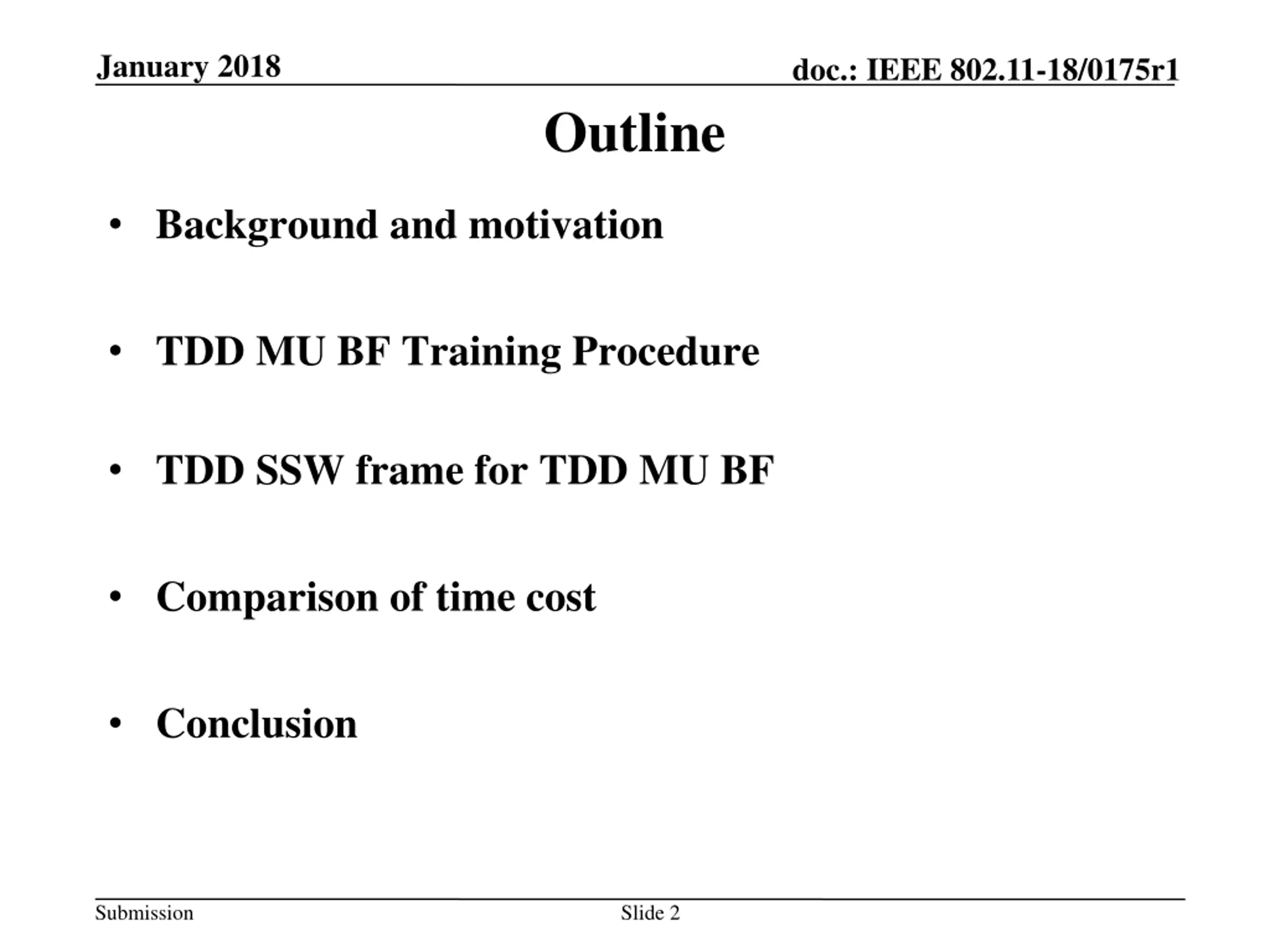 January 2018 doc.: IEEE 802.11-18/0175r1 Outline Background and motivation TDD MU BF Training Procedure TDD SSW frame for TDD MU BF Comparison of time cost Conclusion Submission Slide 2