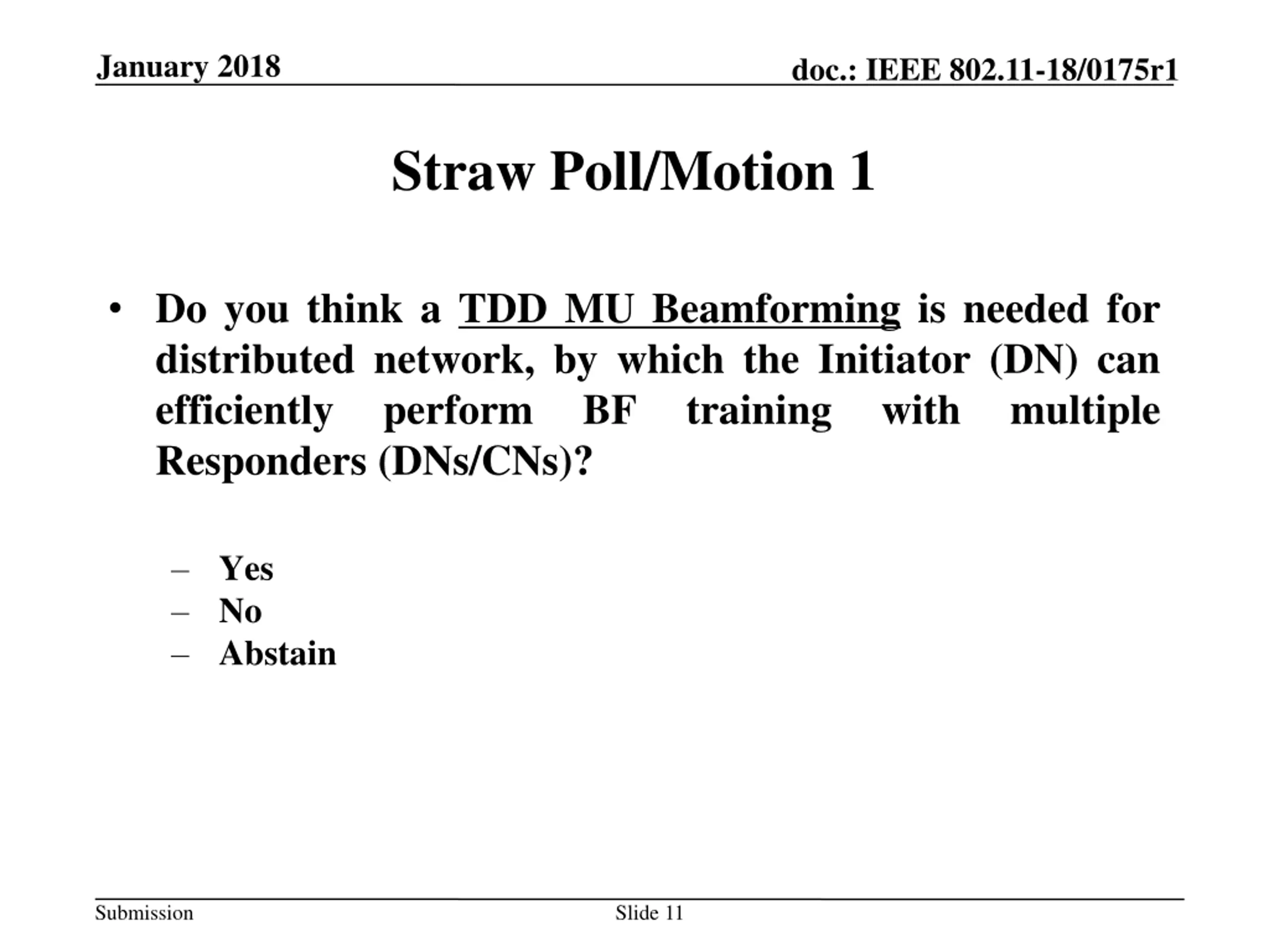 January 2018 doc.: IEEE 802.11-18/0175r1 Straw Poll/Motion 1 Do you think a TDD MU Beamforming is needed for distributed network, by which the Initiator (DN) can efficiently perform BF Responders (DNs/CNs)? training with multiple Yes No Abstain Submission Slide 11