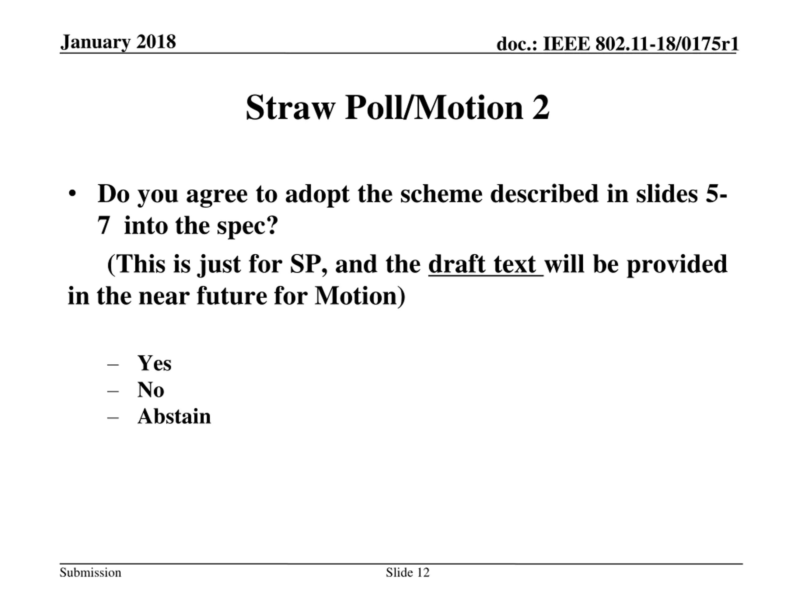 January 2018 doc.: IEEE 802.11-18/0175r1 Straw Poll/Motion 2 Do you agree to adopt the scheme described in slides 5- 7 into the spec? (This is just for SP, and the draft text will be provided in the near future for Motion) Yes No Abstain Submission Slide 12