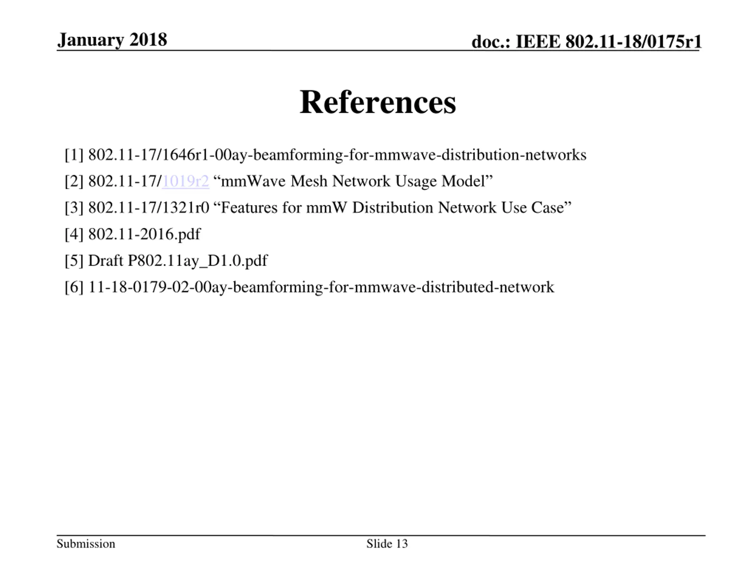 January 2018 doc.: IEEE 802.11-18/0175r1 References [1] 802.11-17/1646r1-00ay-beamforming-for-mmwave-distribution-networks [2] 802.11-17/1019r2 mmWave Mesh Network Usage Model [3] 802.11-17/1321r0 Features for mmW Distribution Network Use Case [4] 802.11-2016.pdf [5] Draft P802.11ay_D1.0.pdf [6] 11-18-0179-02-00ay-beamforming-for-mmwave-distributed-network Submission Slide 13