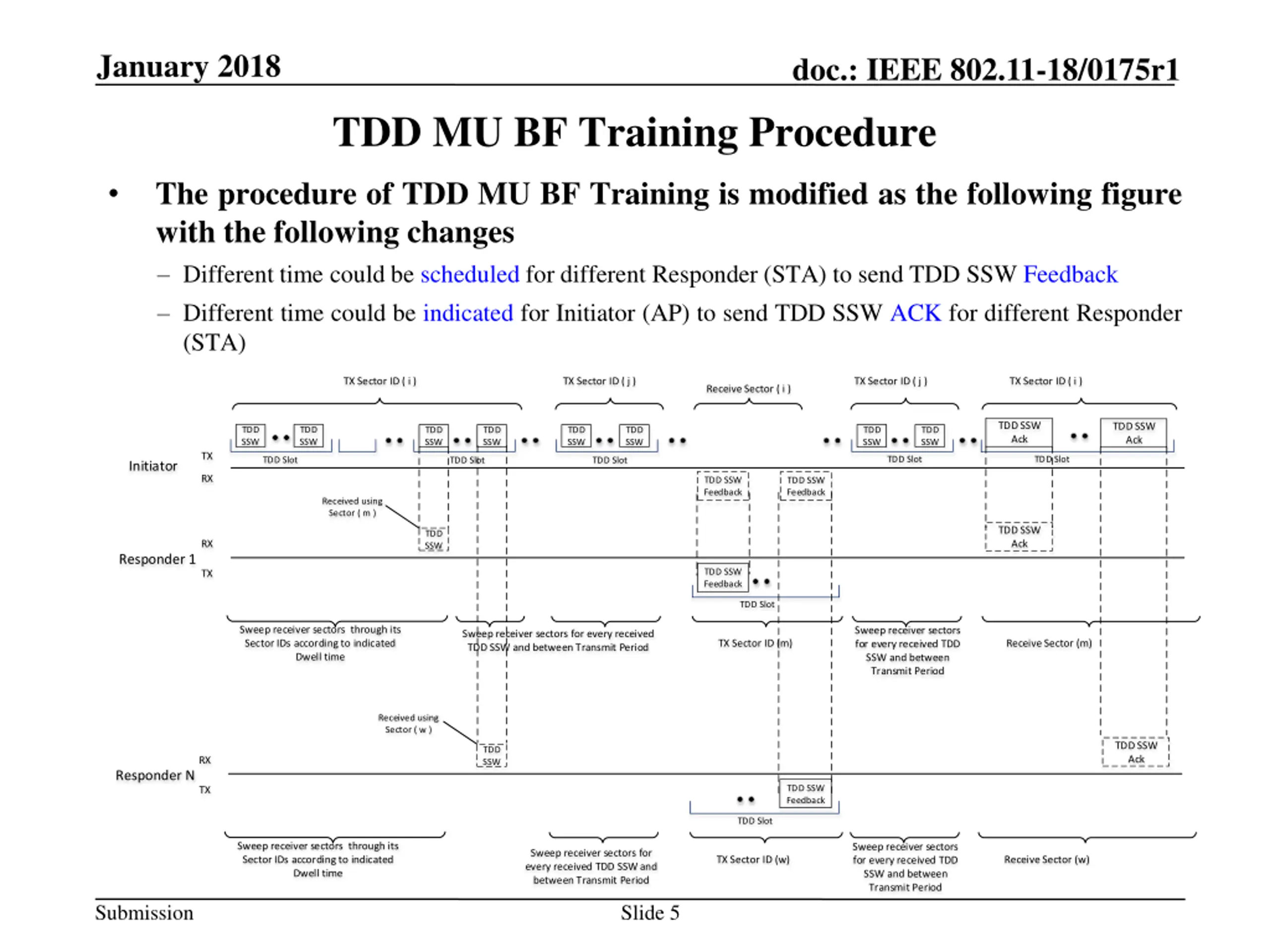 January 2018 doc.: IEEE 802.11-18/0175r1 Background and motivation Hence, we propose an approach to enhance the scheme in [1, 6], in order to solve the Repeating and low efficiency issue, by Adding another procedure for TDD MU BF Modifying the content of the following frames in the case of TDD MU BF TDD SSW frame Submission Slide 4