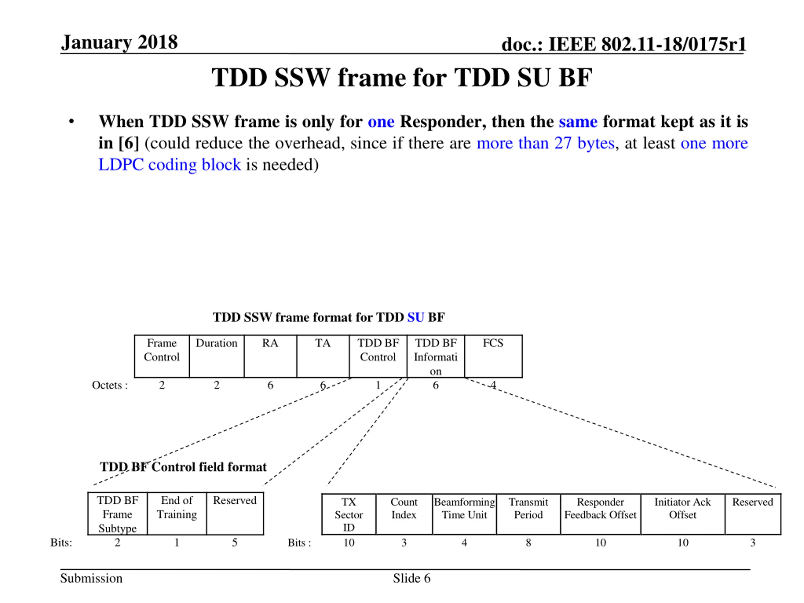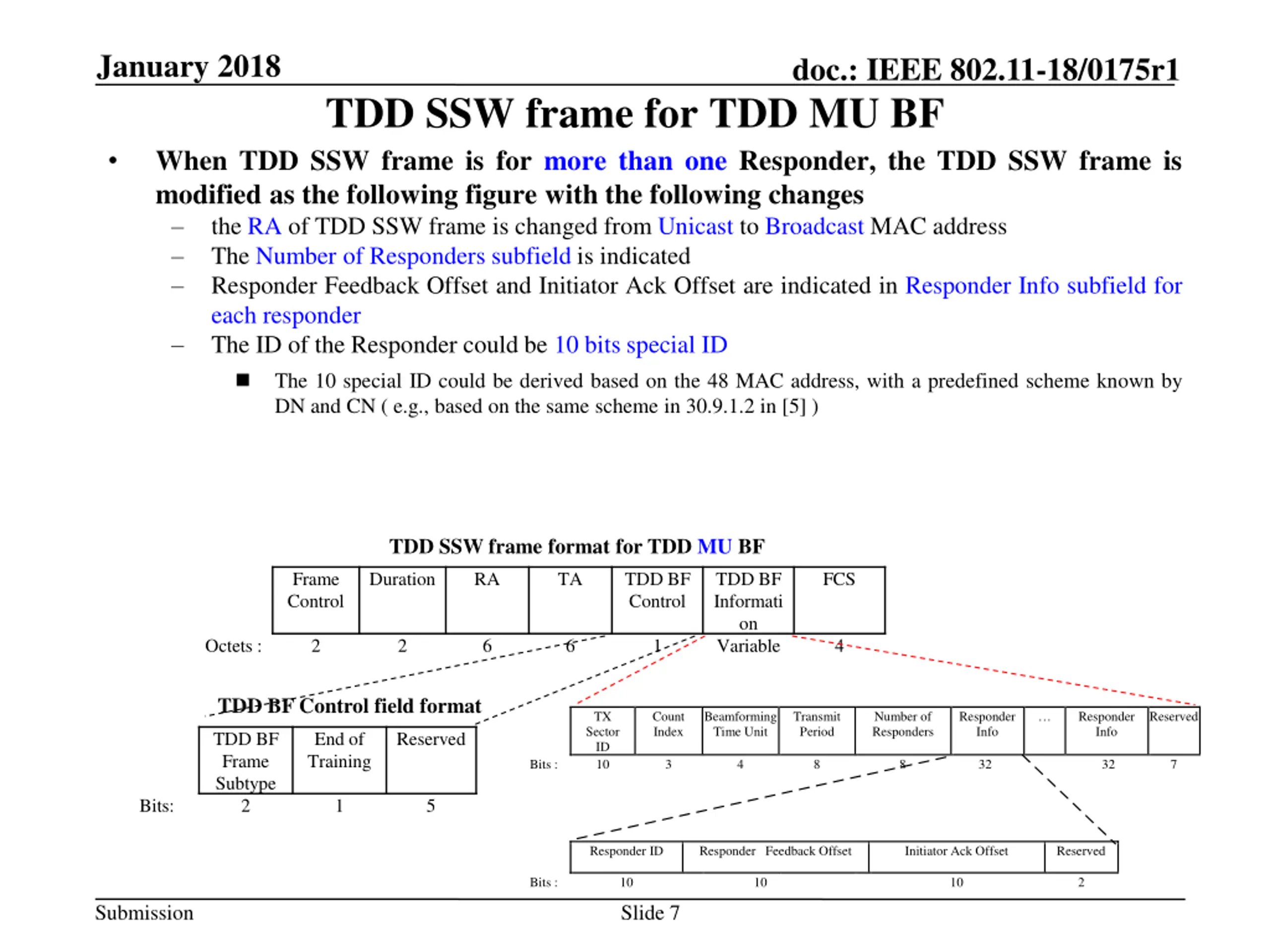 January 2018 doc.: IEEE 802.11-18/0175r1 TDD SSW frame for TDD SU BF When TDD SSW frame is only for one Responder, then the same format kept as it is in [6] (could reduce the overhead, since if there are more than 27 bytes, at least one more LDPC coding block is needed) TDD SSW frame format for TDD SU BF Frame Control Duration RA TA TDD BF Control TDD BF Informati on 6 FCS Octets : 2 2 6 6 1 4 TDD BF Control field format TDD BF Frame Subtype 2 End of Training Reserved TX Sector ID 10 Count Index Beamforming Time Unit Transmit Period Responder Feedback Offset Initiator Ack Offset Reserved Bits: 1 5 Bits : 3 4 8 10 10 3 Submission Slide 6