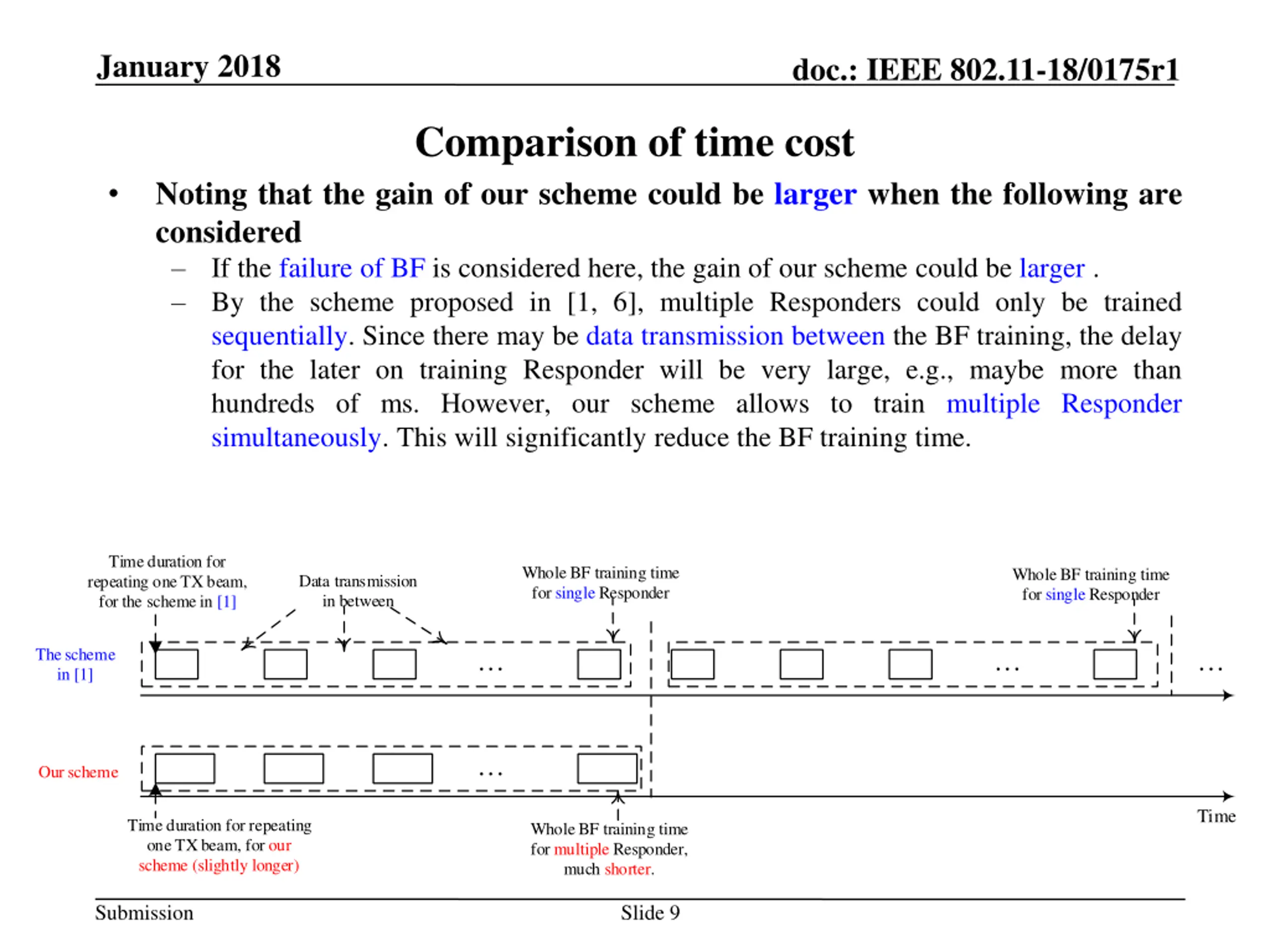 January 2018 doc.: IEEE 802.11-18/0175r1 Comparison of time cost Every TDD slot filled with three or four TDD SSW frames Assumption and configuration TDD slot Duration = 66us, SBIFS = 1us, For the scheme in [1, 6], every TDD slot filled with four TDD SSW frames For our scheme, every TDD slot filled with three TDD SSW frames (for 2-4 Responders), or two TDD SSW frames (for 5-10 Responders) Following figures shows the comparison of time cost for BF training with different number of Responder (calculation details could be found in Appendix I, II) Time cost for scheme in [1, 6]: with very high time cost Our scheme: time cost is much reduced. TDD SSW TDD SSW IFS options (RIFS, SBIFS, SIFS or programmable) under study Submission Slide 8