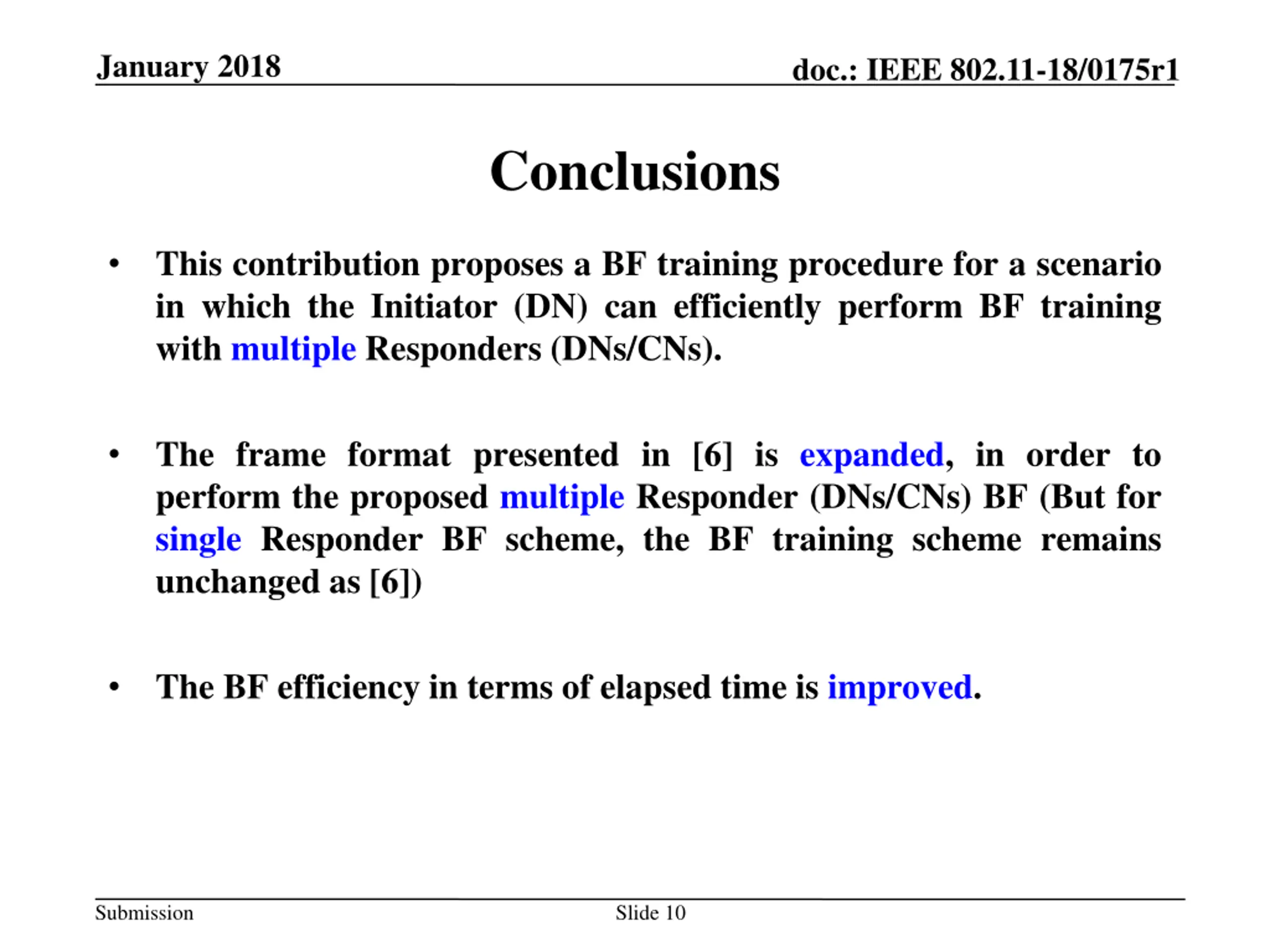 January 2018 doc.: IEEE 802.11-18/0175r1 Conclusions This contribution proposes a BF training procedure for a scenario in which the Initiator (DN) can efficiently perform BF training with multiple Responders (DNs/CNs). The frame format presented in [6] is expanded, in order to perform the proposed multiple Responder (DNs/CNs) BF (But for single Responder BF scheme, the BF training scheme remains unchanged as [6]) The BF efficiency in terms of elapsed time is improved. Submission Slide 10