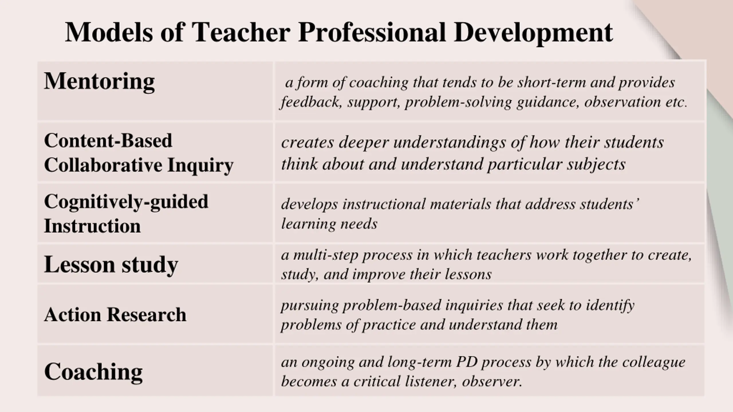 Models of Teacher Professional Development Mentoring a form of coaching that tends to be short-term and provides feedback, support, problem-solving guidance, observation etc. Content-Based Collaborative Inquiry creates deeper understandings of how their students think about and understand particular subjects Cognitively-guided Instruction Lesson study develops instructional materials that address students learning needs a multi-step process in which teachers work together to create, study, and improve their lessons pursuing problem-based inquiries that seek to identify problems of practice and understand them Action Research an ongoing and long-term PD process by which the colleague becomes a critical listener, observer. Coaching