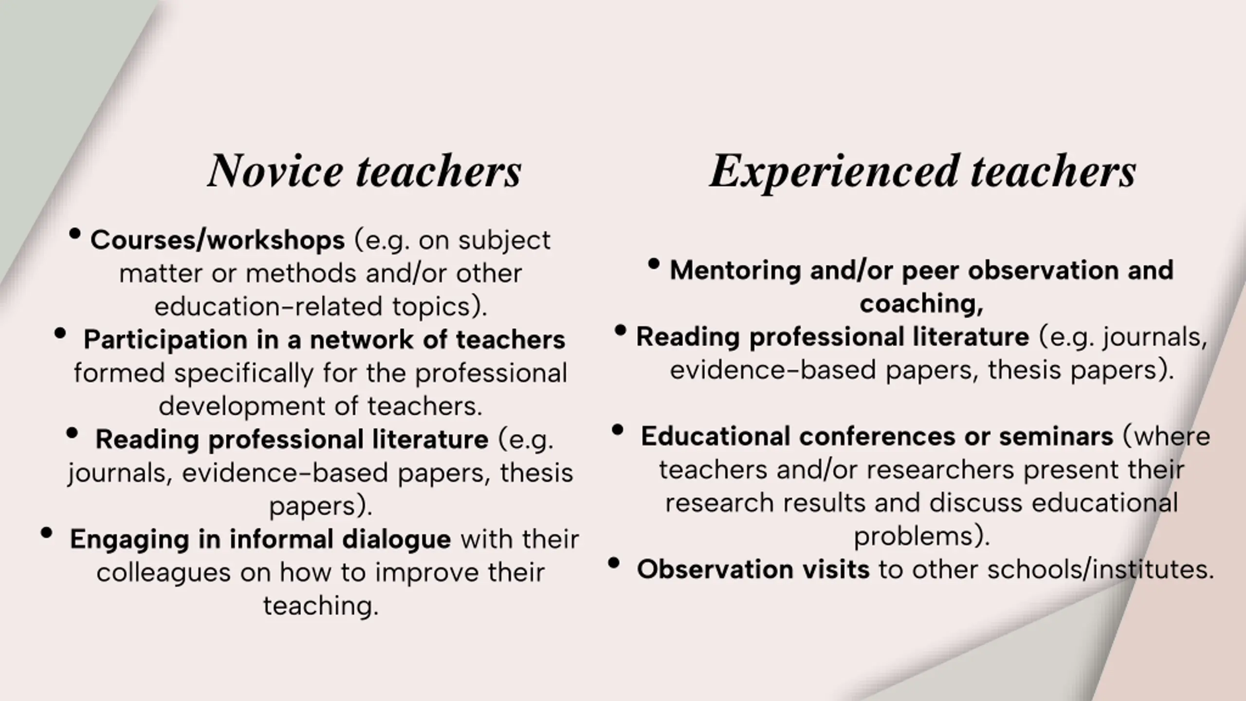 Novice teachers Courses/workshops (e.g. on subject matter or methods and/or other education-related topics). Participation in a network of teachers formed specifically for the professional development of teachers. Reading professional literature (e.g. journals, evidence-based papers, thesis papers). Engaging in informal dialogue with their colleagues on how to improve their teaching. Experienced teachers Mentoring and/or peer observation and coaching, Reading professional literature (e.g. journals, evidence-based papers, thesis papers). Educational conferences or seminars (where teachers and/or researchers present their research results and discuss educational problems). Observation visits to other schools/institutes.