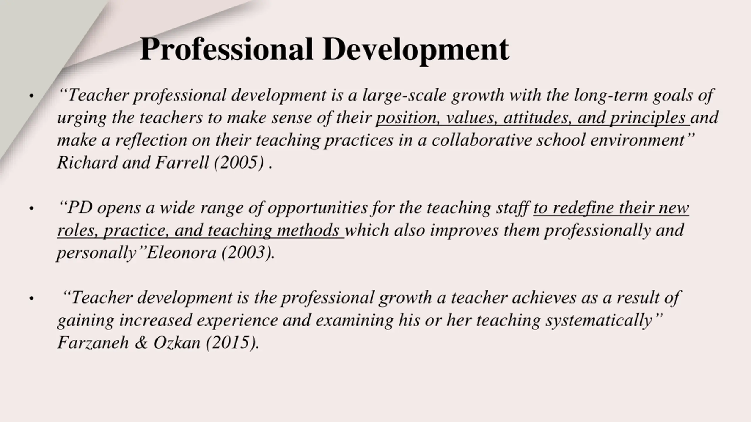Professional Development Teacher professional development is a large-scale growth with the long-term goals of urging the teachers to make sense of their position, values, attitudes, and principles and make a reflection on their teaching practices in a collaborative school environment Richard and Farrell (2005) . PD opens a wide range of opportunities for the teaching staff to redefine their new roles, practice, and teaching methods which also improves them professionally and personally Eleonora (2003). Teacher development is the professional growth a teacher achieves as a result of gaining increased experience and examining his or her teaching systematically Farzaneh & Ozkan (2015).