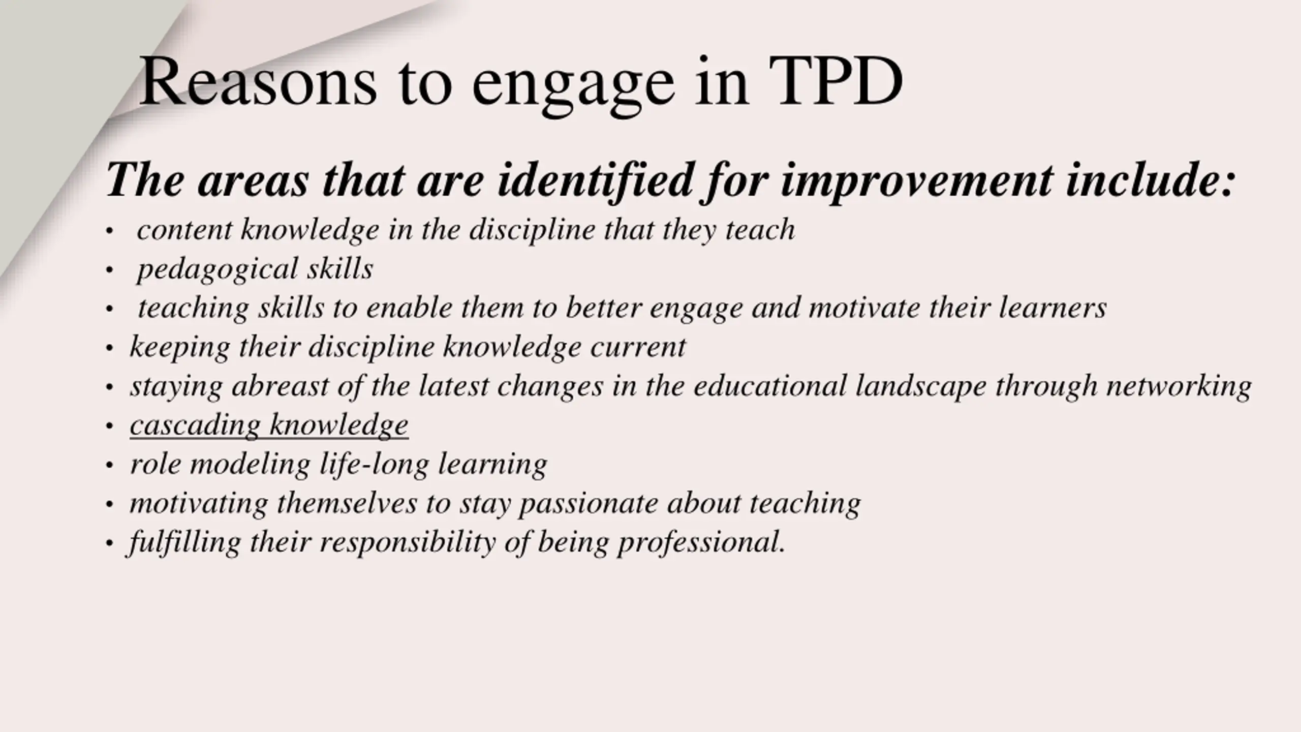 Reasons to engage in TPD The areas that are identified for improvement include: content knowledge in the discipline that they teach pedagogical skills teaching skills to enable them to better engage and motivate their learners keeping their discipline knowledge current staying abreast of the latest changes in the educational landscape through networking cascading knowledge role modeling life-long learning motivating themselves to stay passionate about teaching fulfilling their responsibility of being professional.