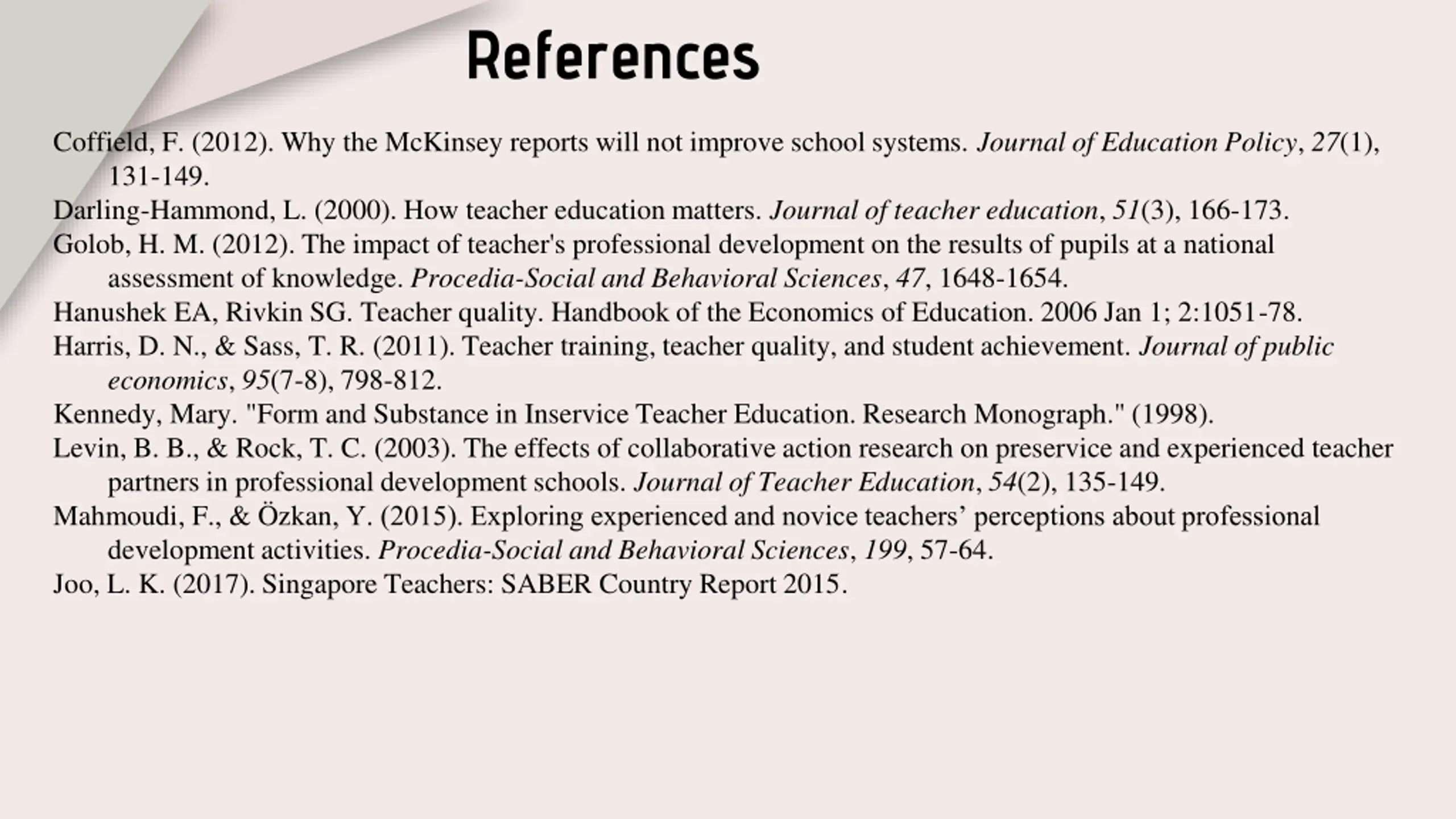 References Coffield, F. (2012). Why the McKinsey reports will not improve school systems. Journal of Education Policy, 27(1), 131-149. Darling-Hammond, L. (2000). How teacher education matters. Journal of teacher education, 51(3), 166-173. Golob, H. M. (2012). The impact of teacher's professional development on the results of pupils at a national assessment of knowledge. Procedia-Social and Behavioral Sciences, 47, 1648-1654. Hanushek EA, Rivkin SG. Teacher quality. Handbook of the Economics of Education. 2006 Jan 1; 2:1051-78. Harris, D. N., & Sass, T. R. (2011). Teacher training, teacher quality, and student achievement. Journal of public economics, 95(7-8), 798-812. Kennedy, Mary. "Form and Substance in Inservice Teacher Education. Research Monograph." (1998). Levin, B. B., & Rock, T. C. (2003). The effects of collaborative action research on preservice and experienced teacher partners in professional development schools. Journal of Teacher Education, 54(2), 135-149. Mahmoudi, F., & zkan, Y. (2015). Exploring experienced and novice teachers perceptions about professional development activities. Procedia-Social and Behavioral Sciences, 199, 57-64. Joo, L. K. (2017). Singapore Teachers: SABER Country Report 2015.