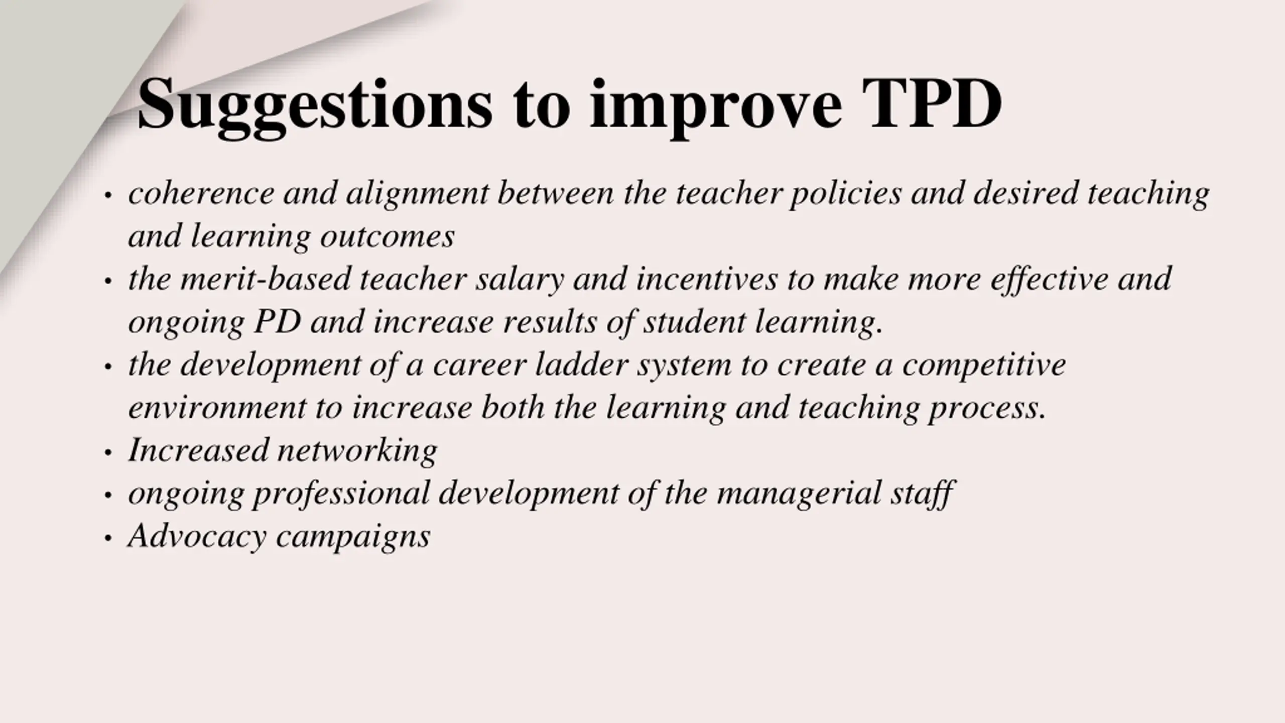 Suggestions to improve TPD coherence and alignment between the teacher policies and desired teaching and learning outcomes the merit-based teacher salary and incentives to make more effective and ongoing PD and increase results of student learning. the development of a career ladder system to create a competitive environment to increase both the learning and teaching process. Increased networking ongoing professional development of the managerial staff Advocacy campaigns