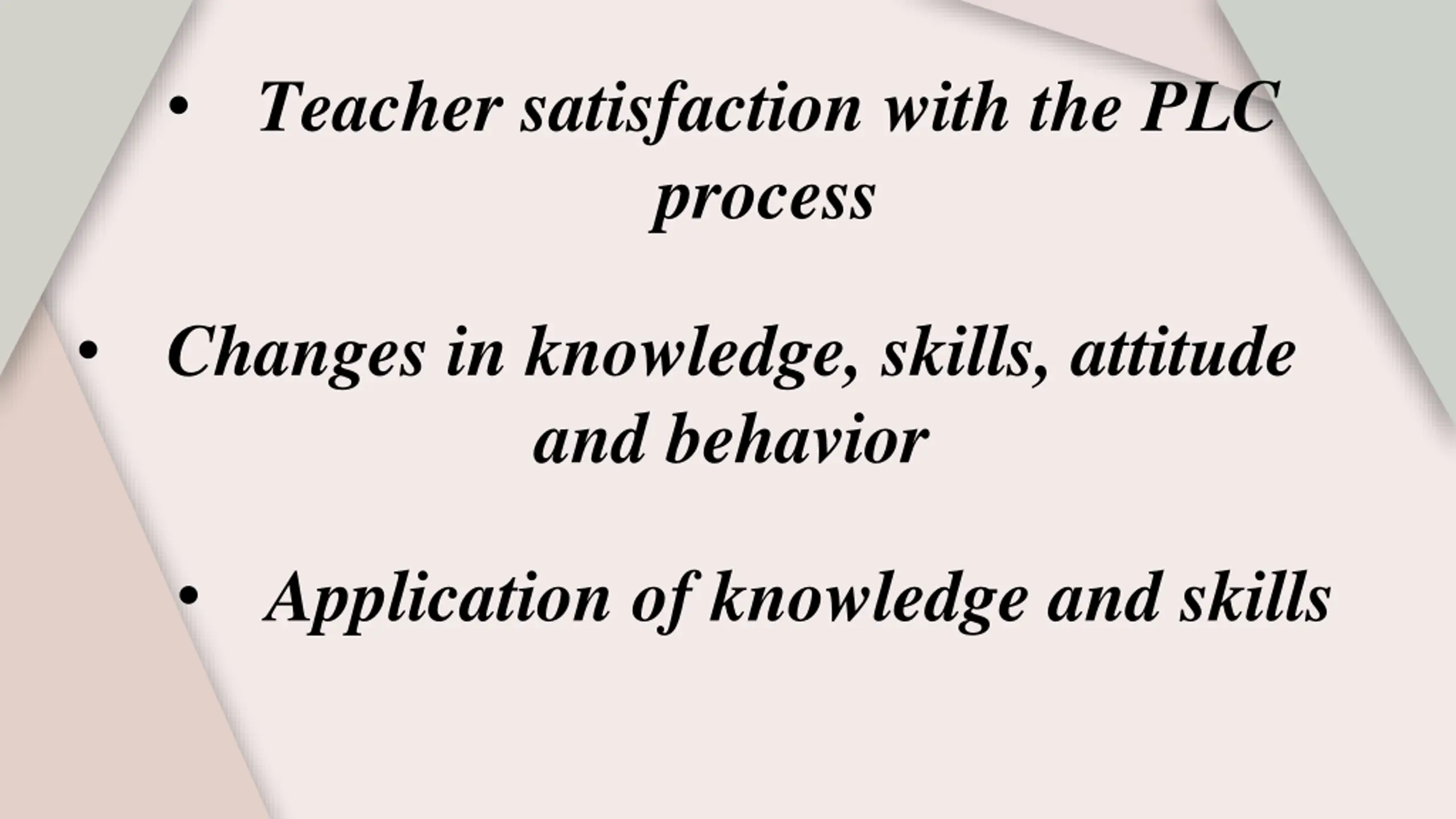 Teacher satisfaction with the PLC process Changes in knowledge, skills, attitude and behavior Application of knowledge and skills