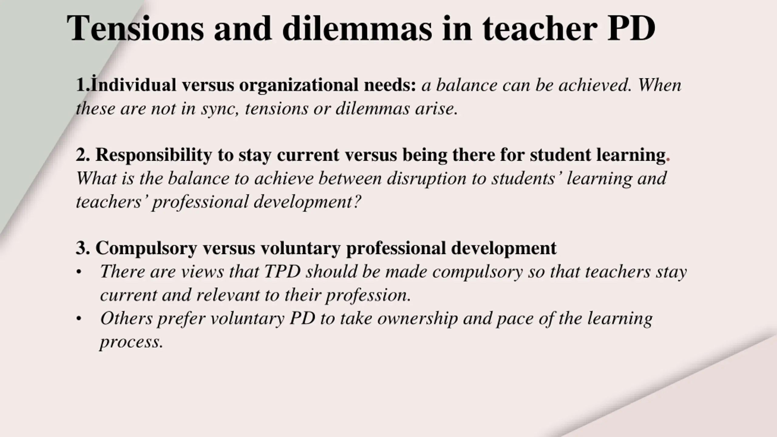 Tensions and dilemmas in teacher PD 1. ndividual versus organizational needs: a balance can be achieved. When these are not in sync, tensions or dilemmas arise. 2. Responsibility to stay current versus being there for student learning. What is the balance to achieve between disruption to students learning and teachers professional development? 3. Compulsory versus voluntary professional development There are views that TPD should be made compulsory so that teachers stay current and relevant to their profession. Others prefer voluntary PD to take ownership and pace of the learning process.