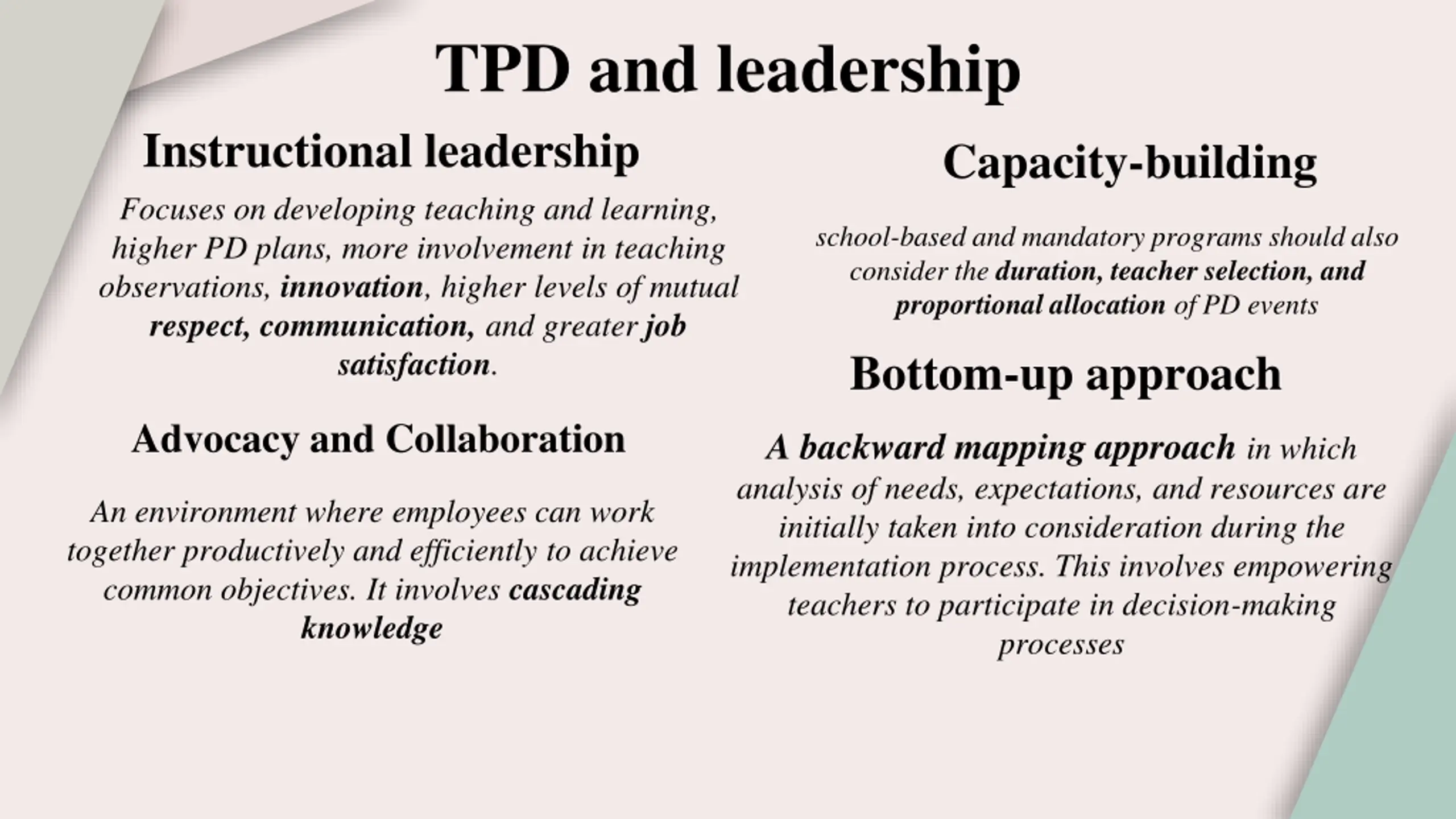 TPD and leadership Instructional leadership Focuses on developing teaching and learning, higher PD plans, more involvement in teaching observations, innovation, higher levels of mutual respect, communication, and greater job satisfaction. Capacity-building school-based and mandatory programs should also consider the duration, teacher selection, and proportional allocation of PD events Bottom-up approach Advocacy and Collaboration A backward mapping approach in which analysis of needs, expectations, and resources are initially taken into consideration during the implementation process. This involves empowering teachers to participate in decision-making processes An environment where employees can work together productively and efficiently to achieve common objectives. It involves cascading knowledge