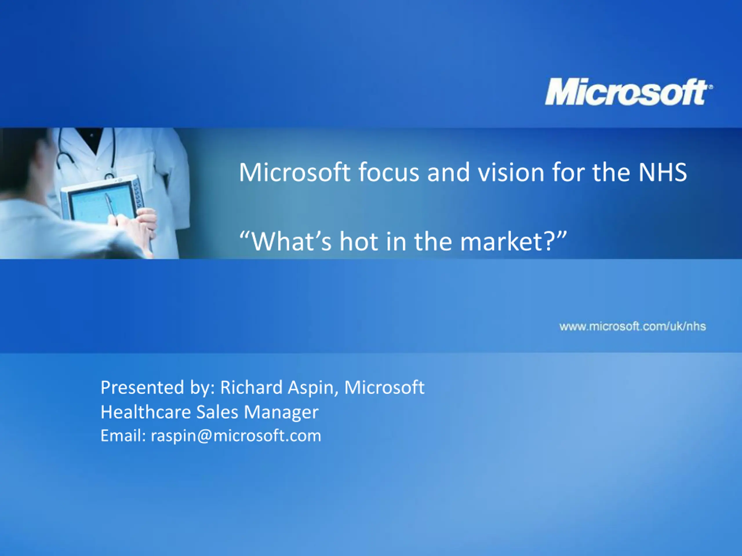 Microsoft focus and vision for the NHS What s hot in the market? Presented by: Richard Aspin, Microsoft Healthcare Sales Manager Email: raspin@microsoft.com