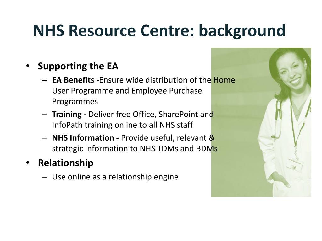 NHS Resource Centre: background Supporting the EA EA Benefits -Ensure wide distribution of the Home User Programme and Employee Purchase Programmes Training - Deliver free Office, SharePoint and InfoPath training online to all NHS staff NHS Information - Provide useful, relevant & strategic information to NHS TDMs and BDMs Relationship Use online as a relationship engine