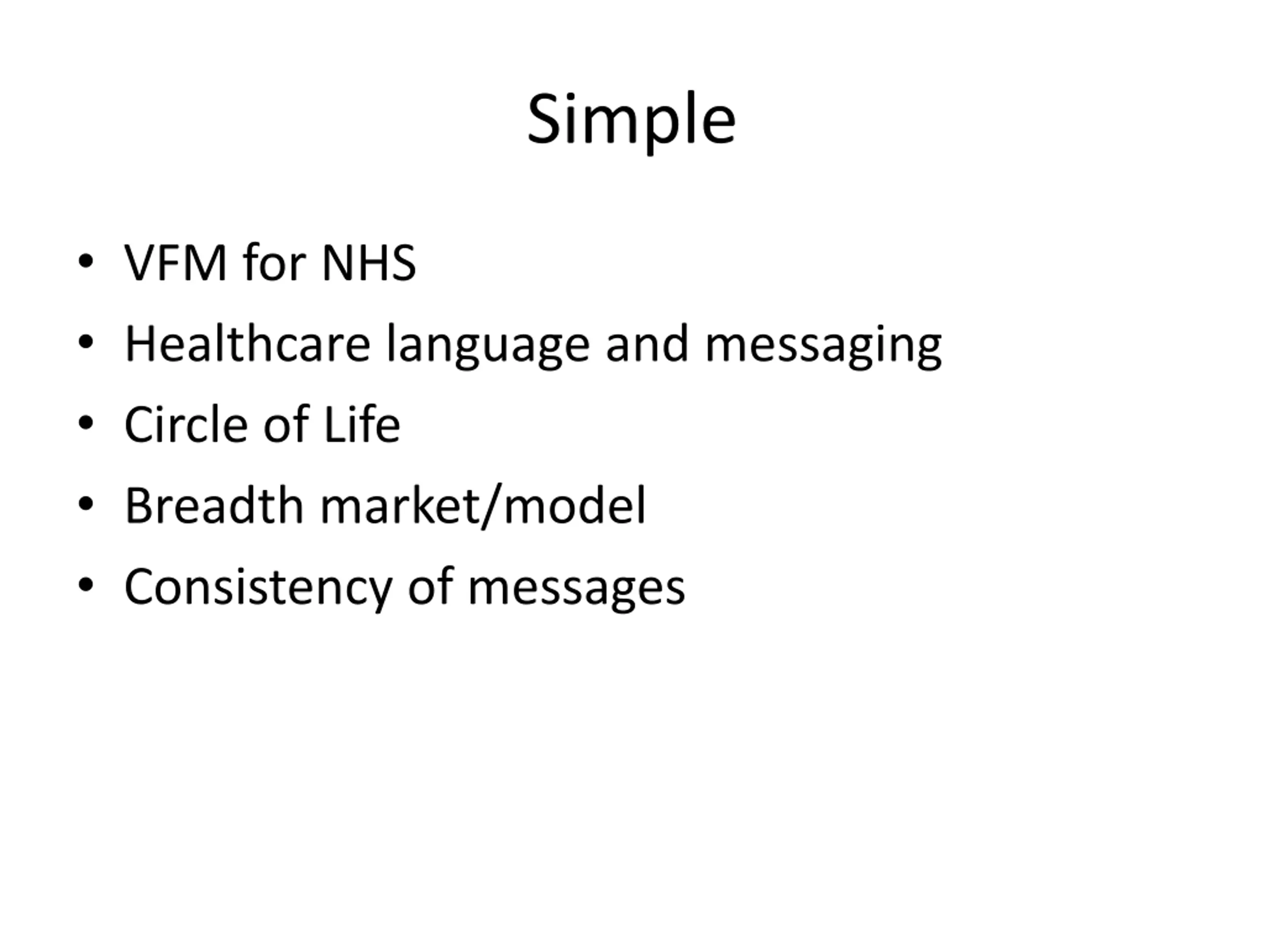 Simple VFM for NHS Healthcare language and messaging Circle of Life Breadth market/model Consistency of messages